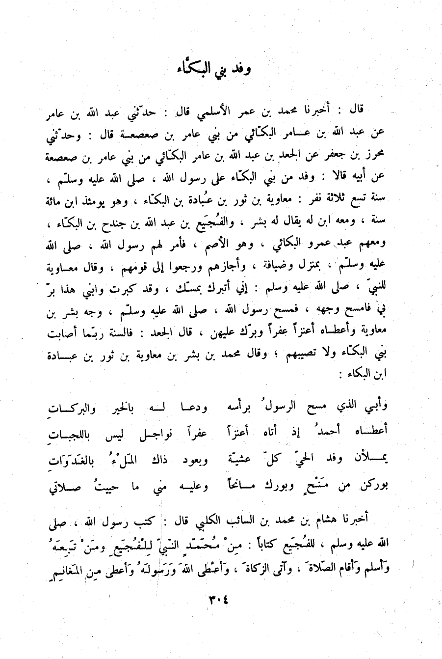 قَالَ: أَخْبَرَنَا مُحَمَّدُ بْنُ عُمَرَ الْأَسْلَمِيُّ قَالَ: حَدَّثَنِي عَبْدُ اللَّهِ بْنُ عَامِرٍ، عَنْ عَبْدِ اللَّهِ بْنِ عَامِرٍ الْبَكَّائِيِّ، مِنْ بَنِي عَامِرِ بْنِ صَعْصَعَةَ قَالَ: وَحَدَّثَنِي مُحْرِزُ بْنُ جَعْفَرٍ، عَنِ الْجَعْدِ بْنِ عَبْدِ اللَّهِ بْنِ عَامِرٍ الْبَكَّائِيِّ مِنْ بَنِي عَامِرِ بْنِ صَعْصَعَةَ، عَنْ أَبِيهِ قَالَا: وَفَدَ مِنْ بَنِي الْبَكَّاءِ عَلَى رَسُولِ اللَّهِ صلّى الله عليه وسلم سَنَةَ تِسْعٍ ثَلَاثَةُ نَفَرٍ مُعَاوِيَةُ بْنُ ثَوْرِ بْنِ عُبَادَةَ بْنِ الْبَكَّاءِ وَهُوَ يَوْمَئِذٍ ابْنُ مِائَةِ سَنَةٍ، وَمَعَهُ ابْنٌ لَهُ يُقَالُ لَهُ: بِشْرٌ وَالْفُجَيْعُ بْنُ عَبْدِ اللَّهِ بْنِ جَنْدَحِ بْنِ الْبَكَّاءِ وَمَعَهُمْ عَبْدُ عَمْرٍو الْبَكَّائِيِّ وَهُوَ الْأَصَمُّ، §فَأَمَرَ لَهُمْ رَسُولُ اللَّهِ صلّى الله عليه وسلم بِمَنْزِلٍ وَضِيَافَةٍ وَأَجَازَهُمْ وَرَجَعُوا إِلَى قَوْمِهِمْ وَقَالَ مُعَاوِيَةُ لِلنَّبِيِّ صلّى الله عليه وسلم: إِنِّي أَتَبَرَّكُ بِمَسِّكَ وَقَدْ كَبِرْتُ وَابْنِي هَذَا بَرٌّ بِي فَامْسَحْ وَجْهَهُ، فَمَسَحَ رَسُولُ اللَّهِ صلّى الله عليه وسلم وَجْهَ بِشْرِ بْنِ مُعَاوِيَةَ وَأَعْطَاهُ أَعْنُزًا عُفْرًا وَبَرَّكَ عَلَيْهِنَّ، قَالُ الْجَعْدُ: فَالسَّنَةُ رُبَّمَا أَصَابَتْ بَنِي الْبَكَّاءِ وَلَا تُصِيبُهُمْ، وَقَالَ مُحَمَّدُ بْنُ بِشْرِ بْنِ مُعَاوِيَةَ بْنِ ثَوْرِ بْنِ عُبَادَةَ بْنِ الْبَكَّاءِ: