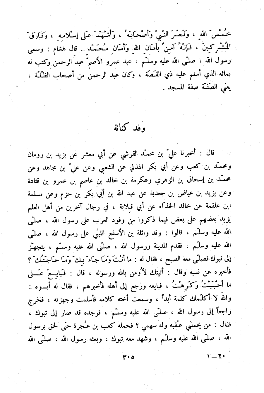 قَالَ: أَخْبَرَنَا عَلِيُّ بْنُ مُحَمَّدٍ الْقُرَشِيُّ، عَنْ أَبِي مَعْشَرٍ، عَنْ يَزِيدَ بْنِ رُومَانَ، وَمُحَمَّدِ بْنِ كَعْبٍ، وَعَنْ أَبِي بَكْرٍ الْهُذَلِيِّ، عَنِ الشَّعْبِيِّ، وَعَنْ عَلِيِّ بْنِ مُجَاهِدٍ، وَعَنْ مُحَمَّدِ بْنِ إِسْحَاقَ بْنِ الزُّهْرِيِّ، وَعِكْرِمَةَ بْنِ خَالِدِ بْنِ عَاصِمِ بْنِ عَمْرِو بْنِ قَتَادَةَ، وَعَنْ يَزِيدَ بْنِ عِيَاضِ بْنِ جُعْدُبَةَ، عَنْ عَبْدِ اللَّهِ بْنِ أَبِي بَكْرِ بْنِ حَزْمٍ، وَعَنْ مَسْلَمَةَ بْنِ عَلْقَمَةَ، عَنْ خَالِدٍ الْحَذَّاءِ، عَنْ أَبِي قِلَابَةَ، فِي رِجَالٍ آخَرِينَ مِنْ أَهْلِ الْعِلْمِ يَزِيدُ بَعْضُهُمْ عَلَى بَعْضٍ فِيمَا ذَكَرُوا مِنْ وُفُودِ الْعَرَبِ عَلَى رَسُولِ اللَّهِ صلّى الله عليه وسلم قَالُوا: وَفَدَ وَاثِلَةُ بْنُ الْأَسْقَعِ اللَّيْثِيُّ عَلَى رَسُولِ اللَّهِ صلّى الله عليه وسلم فَقَدِمَ الْمَدِينَةَ وَرَسُولُ اللَّهِ صلّى الله عليه وسلم يَتَجَهَّزُ إِلَى تَبُوكَ فَصَلَّى مَعَهُ الصُّبْحَ، فَقَالَ لَهُ: «§مَا أَنْتَ وَمَا جَاءَ بِكَ وَمَا حَاجَتُكَ؟» فَأَخْبَرَهُ عَنْ نَسَبِهِ، وَقَالَ: أَتَيْتُكَ لِأُومِنَ بِاللَّهِ وَرَسُولِهِ قَالَ: «فَبَايِعْ عَلَى مَا أَحْبَبْتُ وَكَرِهْتُ» فَبَايَعَهُ وَرَجَعَ إِلَى أَهْلِهِ فَأَخْبَرَهُمْ، فَقَالَ لَهُ أَبُوهُ: وَاللَّهِ لَا أُكَلِّمُكَ كَلِمَةً أَبَدًا وَسَمِعَتْ أُخْتُهُ كَلَامَهُ فَأَسْلَمَتْ وَجَهَّزَتْهُ، فَخَرَجَ رَاجِعًا إِلَى رَسُولِ اللَّهِ صلّى الله عليه وسلم فَوَجَدَهُ قَدْ صَارَ إِلَى تَبُوكَ فَقَالَ: مَنْ يَحْمِلُنِي عَقِبَهُ وَلَهُ سَهْمِي؟ فَحَمَلَهُ كَعْبُ بْنُ عُجْرَةَ حَتَّى لَحِقَ بِرَسُولِ اللَّهِ صلّى الله عليه وسلم وَشَهِدَ مَعَهُ تَبُوكَ وَبَعَثَهُ رَسُولُ اللَّهِ صلّى الله