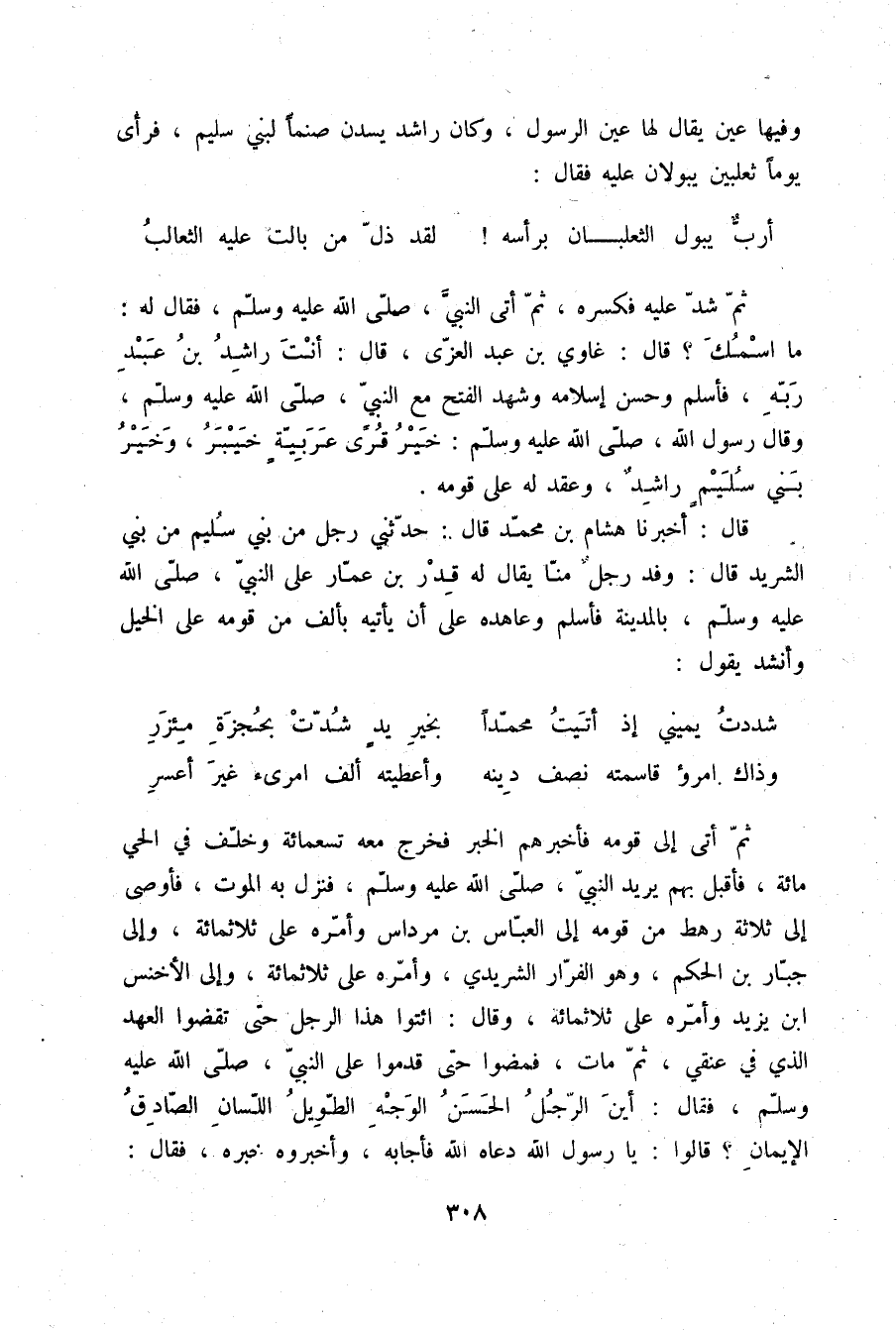 قَالَ: أَخْبَرَنَا هِشَامُ بْنُ مُحَمَّدٍ قَالَ: حَدَّثَنِي رَجُلٌ مِنْ بَنِي سُلَيْمٍ مِنْ بَنِي الشَّرِيدِ قَالَ: وَفَدَ رَجُلٌ مِنَّا يُقَالُ لَهُ: قِدْرُ بْنُ عَمَّارٍ عَلَى النَّبِيِّ صلّى الله عليه وسلم بِالْمَدِينَةِ فَأَسْلَمَ وَعَاهَدَهُ عَلَى أَنْ يَأْتِيَهُ بِأَلْفٍ مِنْ قَوْمِهِ عَلَى الْخَيْلِ، وَأَنْشَدَ يَقُولُ: