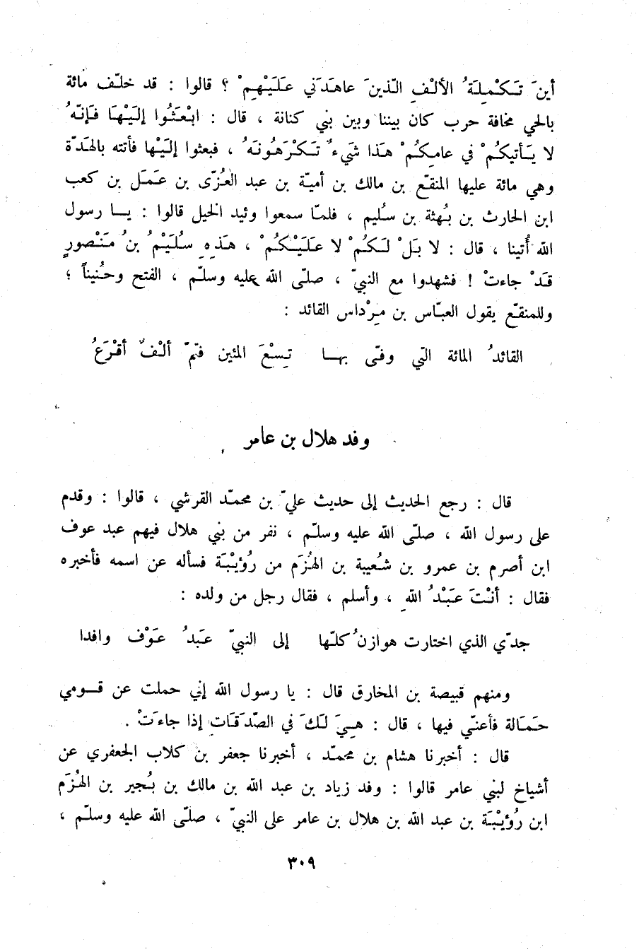 قَالَ: أَخْبَرَنَا هِشَامُ بْنُ مُحَمَّدٍ، أَخْبَرَنَا جَعْفَرُ بْنُ كِلَابٍ الْجَعْفَرِيُّ، عَنْ أَشْيَاخٍ لِبَنِي عَامِرٍ قَالُوا: وَفَدَ زِيَادُ بْنُ عَبْدِ اللَّهِ بْنِ مَالِكِ بْنِ بُجَيْرِ بْنِ الْهُزَمِ بْنِ رُؤَيْبَةَ بْنِ عَبْدِ اللَّهِ بْنِ هِلَالِ بْنِ عَامِرٍ عَلَى النَّبِيِّ صلّى الله عليه وسلم