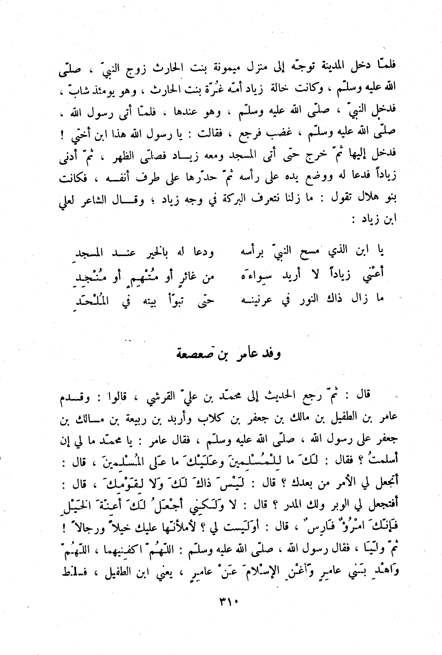 §وَفْدُ عَامِرِ بْنِ صَعْصَعَةَ قَالَ: ثُمَّ رَجَعَ الْحَدِيثُ إِلَى مُحَمَّدِ بْنِ عَلِيٍّ الْقُرَشِيِّ قَالُوا: وَقَدِمَ عَامِرُ بْنُ الطُّفَيْلِ بْنِ مَالِكِ بْنِ جَعْفَرِ بْنِ كِلَابٍ وَأَرْبَدُ بْنُ رَبِيعَةَ بْنِ مَالِكِ بْنِ جَعْفَرٍ عَلَى رَسُولِ اللَّهِ صلّى الله عليه وسلم، فَقَالَ عَامِرٌ: يَا مُحَمَّدُ مَا لِي إِنْ أَسْلَمْتُ؟ فَقَالَ: «لَكَ مَا لِلْمُسْلِمِينَ وَعَلَيْكَ مَا عَلَى الْمُسْلِمِينَ» قَالَ: أَتَجْعَلُ لِي الْأَمْرَ مِنْ بَعْدَكِ؟ قَالَ: «لَيْسَ ذَاكَ لَكَ وَلَا لِقَوْمِكَ» قَالَ: أَفَتَجْعَلُ لِي الْوَبَرَ وَلَكَ الْمَدَرَ؟ قَالَ: «لَا، وَلَكِنِّي أَجْعَلُ لَكَ أَعِنَّةَ الْخَيْلِ فَإِنَّكَ امْرُؤٌ فَارِسٌ» قَالَ: أَوَلَيْسَتْ لِي؟ لَأَمْلَأَنَّهَا عَلَيْكَ خَيْلًا وَرِجَالًا ثُمَّ وَلَّيَا، فَقَالَ رَسُولُ اللَّهِ صلّى الله عليه وسلم: «اللَّهُمَّ أَكْفِنِيهُمَا، اللَّهُمَّ وَاهْدِ بَنِي عَامِرٍ وَأَغْنِ الْإِسْلَامَ عَنْ عَامِرٍ» ، يَعْنِي ابْنَ الطُّفَيْلِ فَسَلَّطَ
