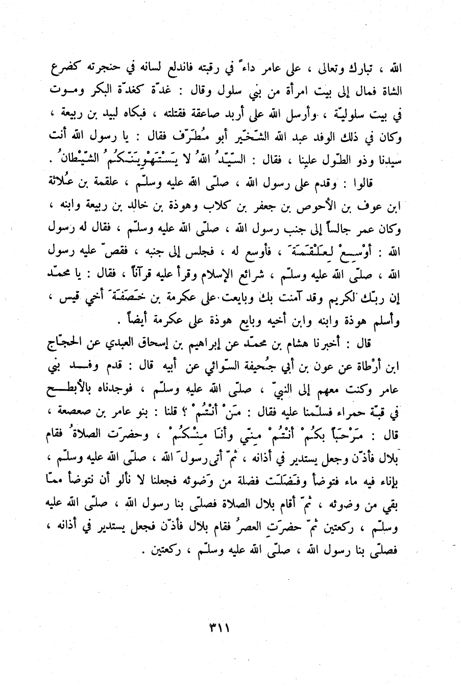 اللَّهُ تَبَارَكَ وَتَعَالَى عَلَى عَامِرٍ دَاءً فِي رَقَبَتِهِ فَانْدَلَعَ لِسَانُهُ فِي حَنْجَرَتِهِ كَضَرْعِ الشَّاةِ، فَمَالَ إِلَى بَيْتِ امْرَأَةٍ مِنْ بَنِي سَلُولٍ، وَقَالَ: غُدَّةٌ كَغُدَّةِ الْبَكْرِ وَمَوْتٌ فِي بَيْتِ سَلُولِيَّةٍ، وَأَرْسَلَ اللَّهُ عَلَى أَرْبَدَ صَاعِقَةً فَقَتَلَتْهُ، فَبَكَاهُ لَبِيدُ بْنُ رَبِيعَةَ، وَكَانَ فِي ذَلِكَ الْوَفْدِ عَبْدُ اللَّهِ بْنُ الشِّخِّيرِ أَبُو مُطَرِّفٍ فَقَالَ: يَا رَسُولَ اللَّهِ، أَنْتَ سَيِّدُنَا وَذُو الطَّوْلِ عَلَيْنَا، فَقَالَ: «السَّيِّدُ اللَّهُ لَا يَسْتَهْوِيَنَّكُمُ الشَّيْطَانُ» قَالُوا: وَقَدِمَ عَلَى رَسُولِ اللَّهِ صلّى الله عليه وسلم عَلْقَمَةُ بْنُ عُلَاثَةَ بْنِ عَوْفِ بْنِ الْأَحْوَصِ بْنِ جَعْفَرِ بْنِ كِلَابٍ وَهَوْذَةُ بْنُ خَالِدِ بْنِ رَبِيعَةَ وَابْنُهُ، وَكَانَ عُمَرُ جَالِسًا إِلَى جَنْبِ رَسُولِ اللَّهِ صلّى الله عليه وسلم، فَقَالَ لَهُ رَسُولُ اللَّهِ: «أَوْسِعْ لِعَلْقَمَةَ» فَأَوْسَعَ لَهُ، فَجَلَسَ إِلَى جَنْبِهِ فَقَصَّ عَلَيْهِ رَسُولُ اللَّهِ صلّى الله عليه وسلم شَرَائِعَ الْإِسْلَامِ، وَقَرَأَ عَلَيْهِ قُرْآنًا، فَقَالَ: يَا مُحَمَّدُ إِنَّ رَبَّكَ لَكَرِيمٌ وَقَدْ آمَنْتُ بِكَ وَبَايَعْتُ عَلَى عِكْرِمَةَ بْنِ خَصَفَةَ أَخِي قَيْسٍ، وَأَسْلَمَ هَوْذَةُ وَابْنُهُ وَابْنُ أَخِيهِ وَبَايَعَ هَوْذَةُ عَلَى عِكْرِمَةَ أَيْضًا