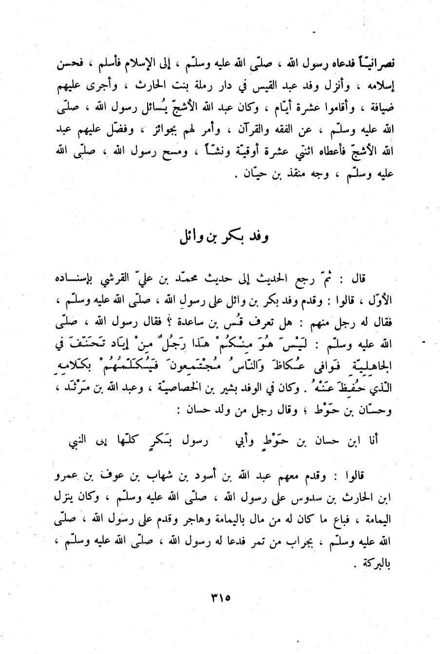 §وَفْدُ بَكْرِ بْنِ وَائِلٍ قَالَ: ثُمَّ رَجَعَ الْحَدِيثُ إِلَى حَدِيثِ مُحَمَّدِ بْنِ عَلِيٍّ الْقُرَشِيِّ بِإِسْنَادِهِ الْأَوَّلِ قَالُوا: وَقَدِمَ وَفْدُ بَكْرِ بْنِ وَائِلٍ عَلَى رَسُولِ اللَّهِ صلّى الله عليه وسلم فَقَالَ لَهُ رَجُلٌ مِنْهُمْ: هَلْ تَعْرِفُ قُسَّ بْنَ سَاعِدَةَ؟ فَقَالَ رَسُولُ اللَّهِ صلّى الله عليه وسلم: «لَيْسَ هُوَ مِنْكُمْ هَذَا رَجُلٌ مِنْ إِيَادٍ تَحَنَّفَ فِي الْجَاهِلِيَّةِ فَوَافَى عُكَاظًا وَالنَّاسُ مُجْتَمِعُونَ فَيُكَلِّمُهُمْ بِكَلَامِهِ الَّذِي حُفِظَ عَنْهُ» ، وَكَانَ فِي الْوَفْدِ بَشِيرُ بْنُ الْخَصَاصِيَةِ وَعَبْدُ اللَّهِ بْنُ مَرْثَدٍ وَحَسَّانُ بْنُ حَوْطٍ وَقَالَ رَجُلٌ مِنْ وَلَدِ حَسَّانَ: