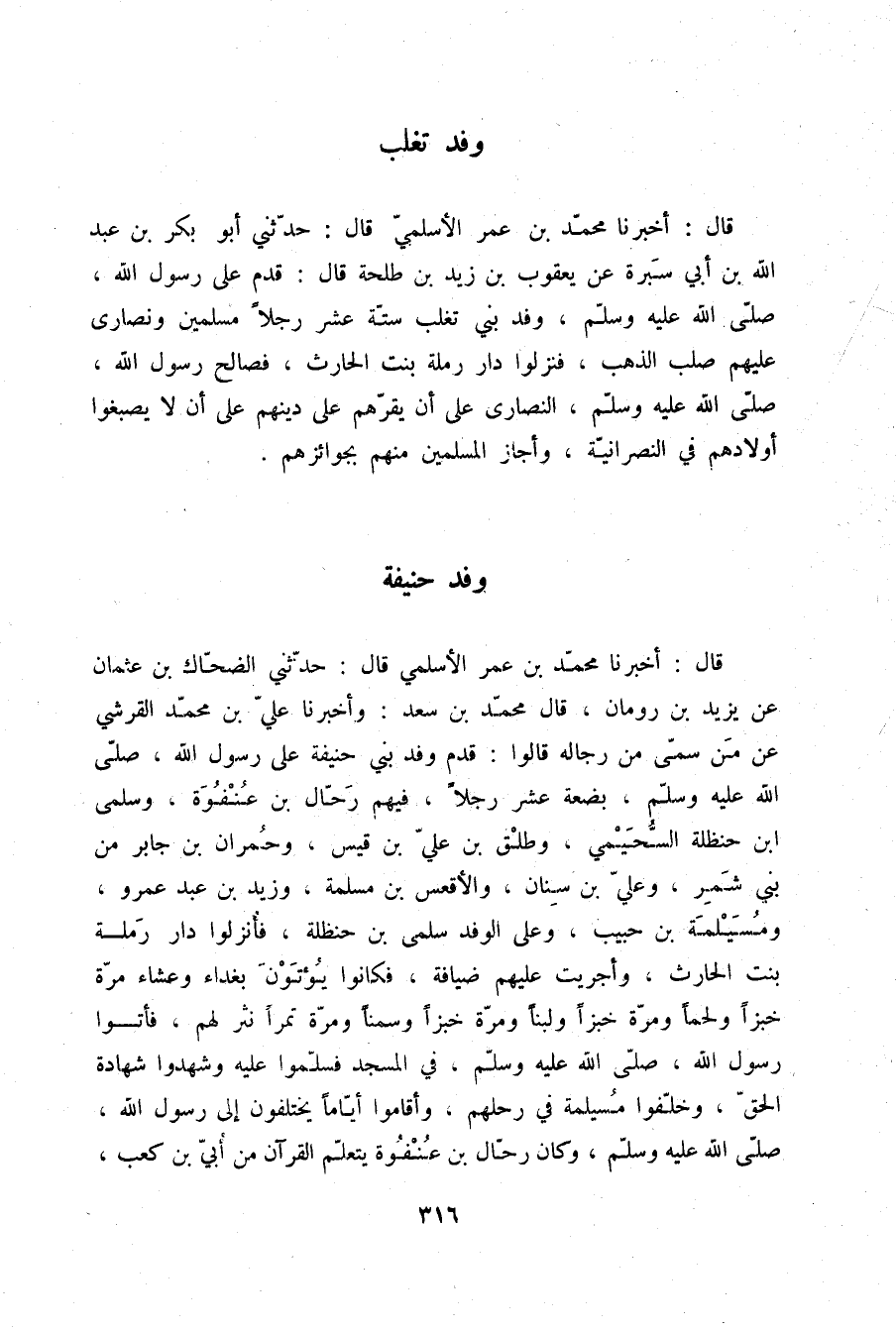 قَالَ: أَخْبَرَنَا مُحَمَّدُ بْنُ عُمَرَ الْأَسْلَمِيُّ قَالَ: حَدَّثَنِي أَبُو بَكْرِ بْنُ عَبْدِ اللَّهِ بْنِ أَبِي سَبْرَةَ، عَنْ يَعْقُوبَ بْنِ زَيْدِ بْنِ طَلْحَةَ قَالَ: §قَدِمَ عَلَى رَسُولِ اللَّهِ صلّى الله عليه وسلم وَفْدُ بَنِي تَغْلِبَ سِتَّةَ عَشَرَ رَجُلًا مُسْلِمِينَ وَنَصَارَى عَلَيْهِمْ صُلُبُ الذَّهَبِ فَنَزَلُوا دَارَ رَمْلَةَ بِنْتِ الْحَارِثِ فَصَالَحَ رَسُولُ اللَّهِ صلّى الله عليه وسلم النَّصَارَى عَلَى أَنْ يُقِرَّهُمْ عَلَى دِينِهِمْ عَلَى أَنْ لَا يُصْبِغُوا أَوْلَادَهُمْ فِي النَّصْرَانِيَّةِ، وَأَجَازَ الْمُسْلِمِينَ مِنْهُمْ بِجَوَائِزِهِمْ