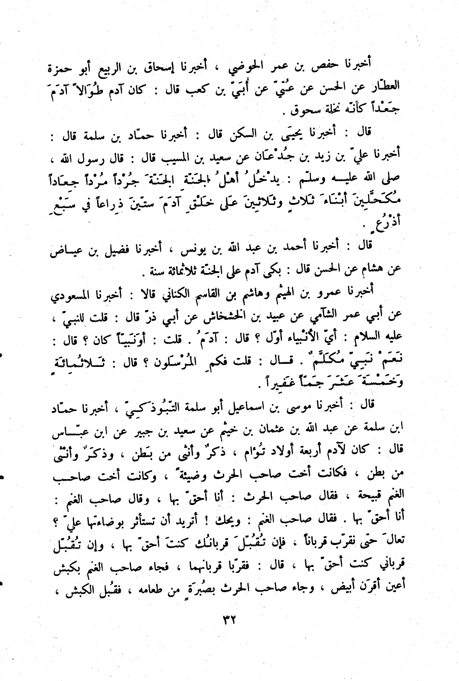 قَالَ: أَخْبَرَنَا مُوسَى بْنُ إِسْمَاعِيلَ أَبُو سَلَمَةَ التَّبُوذَكِيُّ، أَخْبَرَنَا حَمَّادُ بْنُ سَلَمَةَ، عَنْ عَبْدِ اللَّهِ بْنِ عُثْمَانَ بْنِ خَيْثَمٍ، عَنْ سَعِيدِ بْنِ جُبَيْرٍ، عَنِ ابْنِ عَبَّاسٍ قَالَ: " كَانَ §لِآدَمَ أَرْبَعَةُ أَوْلَادٍ تُؤَامٍ ذَكَرٌ وَأُنْثَى مِنْ بَطْنٍ، وَذَكَرٌ وَأُنْثَى مِنْ بَطْنٍ، فَكَانَتْ أُخْتُ صَاحِبِ الْحَرْثِ وَضِيئَةً، وَكَانَتْ أُخْتُ صَاحِبِ الْغَنَمِ قَبِيحَةً، فَقَالَ صَاحِبُ الْحَرْثِ: أَنَا أَحَقُّ بِهَا، وَقَالَ صَاحِبُ الْغَنَمِ: أَنَا أَحَقُّ بِهَا، فَقَالَ صَاحِبُ الْغَنَمِ: وَيْحَكَ، أَتُرِيدُ أَنْ تَسْتَأْثِرَ بِوَضَاءَتِهَا عَلَيَّ، تَعَالَ حَتَّى نُقَرِّبَ قُرْبَانًا، فَإِنْ تُقُبِّلَ قُرْبَانُكَ كُنْتَ أَحَقَّ بِهَا، وَإِنْ تُقُبِّلَ قُرْبَانِي كُنْتُ أَحَقَّ بِهَا، قَالَ: فَقَرَّبَا قُرْبَانَهُمَا فَجَاءَ صَاحِبُ الْغَنَمِ بِكَبْشٍ أَعْيَنَ أَقْرَنَ أَبْيَضَ، وَجَاءَ صَاحِبُ الْحَرْثِ بِصُبْرَةٍ مِنْ طَعَامِهِ، فَقُبِلَ الْكَبْشُ