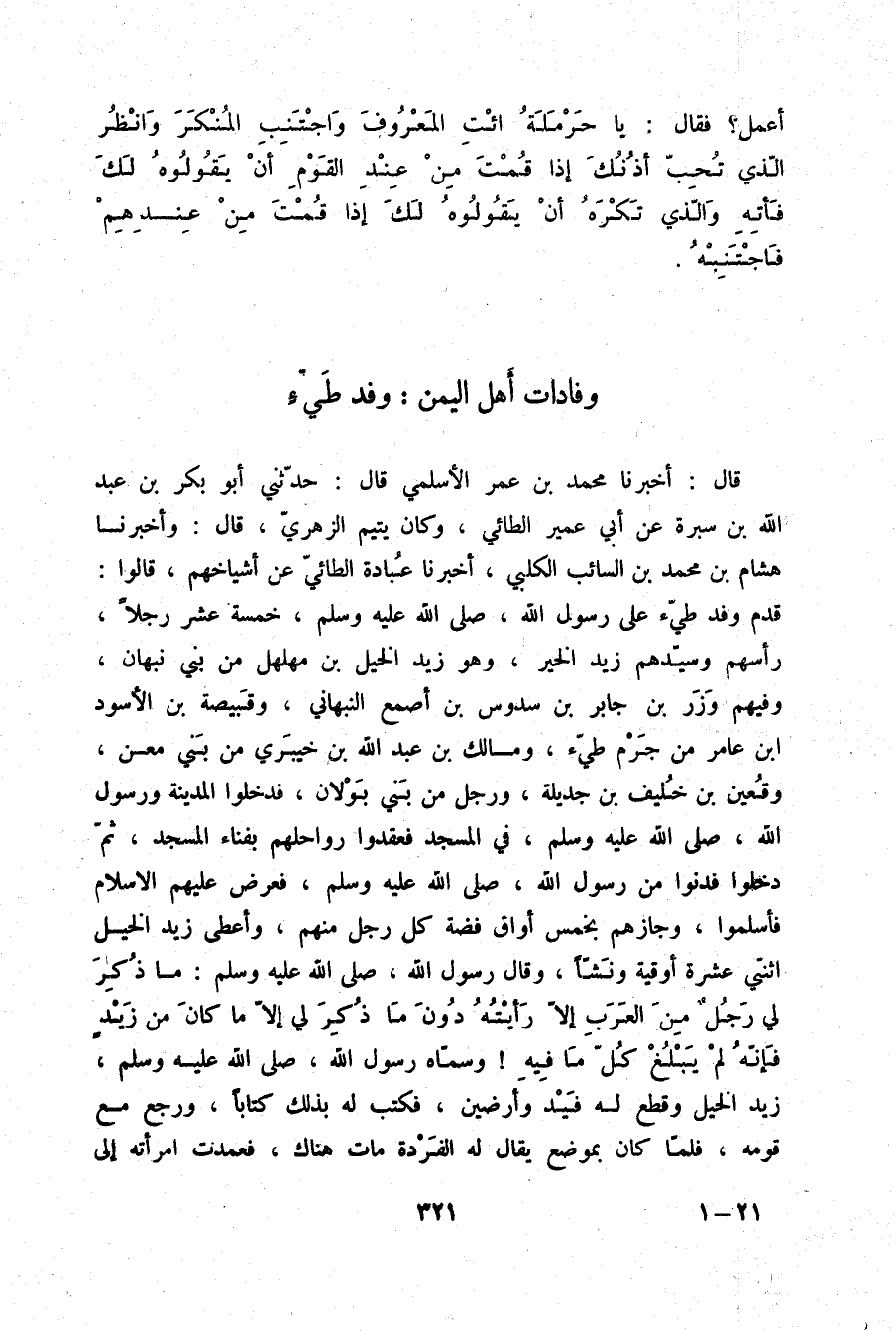 قَالَ: أَخْبَرَنَا مُحَمَّدُ بْنُ عُمَرَ الْأَسْلَمِيُّ قَالَ: حَدَّثَنِي أَبُو بَكْرِ بْنُ عَبْدِ اللَّهِ بْنِ سَبْرَةَ، عَنْ أَبِي عُمَيْرٍ الطَّائِيِّ، وَكَانَ يَتِيمَ الزُّهْرِيِّ قَالَ: وَأَخْبَرَنَا هِشَامُ بْنُ مُحَمَّدِ بْنِ السَّائِبِ الْكَلْبِيُّ، أَخْبَرَنَا عُبَادَةُ الطَّائِيُّ، عَنْ أَشْيَاخِهِمْ، قَالُوا: قَدِمَ وَفْدُ طَيِّئٍ عَلَى رَسُولِ اللَّهِ صلّى الله عليه وسلم خَمْسَةَ عَشَرَ رَجُلًا، رَأْسُهُمْ وَسَيِّدُهُمْ زَيْدُ الْخَيْرِ وَهُوَ زَيْدُ الْخَيْلِ بْنُ مُهَلْهِلٍ مِنْ بَنِي نَبْهَانَ، وَفِيهِمْ وَزَرُ بْنُ جَابِرِ بْنِ سَدُوسِ بْنِ أَصْمَعَ النَّبْهَانِيُّ وَقَبِيصَةُ بْنُ الْأَسْوَدِ بْنِ عَامِرٍ مِنْ جَرْمِ طَيِّئٍ وَمَالِكُ بْنُ عَبْدِ اللَّهِ بْنِ خَيْبَرِيٍّ مِنْ بَنِي مَعْنٍ وَقُعَيْنُ بْنُ خُلَيْفِ بْنِ جَدِيلَةَ، وَرَجُلٌ مِنْ بَنِي بَوْلَانَ فَدَخَلُوا الْمَدِينَةَ، وَرَسُولُ اللَّهِ صلّى الله عليه وسلم فِي الْمَسْجِدِ فَعَقَدُوا رَوَاحِلَهُمْ بِفِنَاءِ الْمَسْجِدِ، ثُمَّ دَخَلُوا فَدَنَوْا مِنْ رَسُولِ اللَّهِ صلّى الله عليه وسلم فَعَرَضَ عَلَيْهِمُ الْإِسْلَامَ فَأَسْلَمُوا وَجَازَهُمْ بِخَمْسِ أَوَاقٍ فِضَّةٍ كُلَّ رَجُلٍ مِنْهُمْ، وَأَعْطَى زَيْدَ الْخَيْلِ اثْنَتَيْ عَشْرَةَ أُوقِيَّةً وَنَشًّا، وَقَالَ رَسُولُ اللَّهِ صلّى الله عليه وسلم: «§مَا ذُكِرَ لِي رَجُلٌ مِنَ الْعَرَبِ إِلَّا رَأَيْتُهُ دُونَ مَا ذُكِرَ لِي إِلَّا مَا كَانَ مِنْ زَيْدٍ فَإِنَّهُ لَمْ يَبْلُغْ كُلَّ مَا فِيهِ» وَسَمَّاهُ رَسُولُ اللَّهِ صلّى الله عليه وسلم زَيْدَ الْخَيْرِ وَقَطَعَ لَهُ فَيْدَ وَأَرْضِينَ فَكَتَبَ لَهُ بِذَلِكَ كِتَابًا وَرَجَعَ مَعَ قَوْمِهِ، فَلَمَّا كَانَ بِمَوْضِعٍ يُقَالُ لَهُ: الْفَرْدَةُ مَاتَ هُنَاكَ فَعَمَدَتِ امْرَأَتُهُ إِلَى -[322]- كُلِّ مَا كَانَ النَّبِيُّ صلّى الله عليه وسلم كَتَبَ لَهُ بِهِ فَخَرَّقَتْهُ، وَكَانَ رَسُولُ اللَّهِ صلّى الله عليه وسلم قَدْ بَعَثَ عَلِيَّ بْنَ أَبِي طَالِبٍ إِلَى الْفُلْسِ صَنَمِ طَيِّئٍ يَهْدِمُهُ وَيَشِنُّ الْغَارَاتِ، فَخَرَجَ فِي مِائَتَيْ فَرَسٍ فَأَغَارَ عَلَى حَاضِرِ آلِ حَاتِمٍ فَأَصَابُوا ابْنَةَ حَاتِمٍ فَقَدِمَ بِهَا عَلَى رَسُولِ اللَّهِ صلّى الله عليه وسلم فِي سَبَايَا مِنْ طَيِّئٍ، وَفِي حَدِيثِ هِشَامِ بْنِ مُحَمَّدٍ أَنَّ الَّذِي أَغَارَ عَلَيْهِمْ وَسَبَى ابْنَةَ حَاتِمٍ مِنْ خَيْلِ النَّبِيِّ صلّى الله عليه وسلم خَالِدُ بْنُ الْوَلِيدِ ثُمَّ رَجَعَ الْحَدِيثُ إِلَى الْأَوَّلِ قَالَ: وَهَرَبَ عَدِيُّ بْنُ حَاتِمٍ مِنْ خَيْلِ النَّبِيِّ صلّى الله عليه وسلم حَتَّى لَحِقَ بِالشَّامِ وَكَانَ عَلَى النَّصْرَانِيَّةِ، وَكَانَ يَسِيرُ فِي قَوْمِهِ بِالْمِرْبَاعِ وَجُعِلَتِ ابْنَةُ حَاتِمٍ فِي حَظِيرَةٍ بِبَابِ الْمَسْجِدِ، وَكَانَتِ امْرَأَةً جَمِيلَةً جَزْلَةً فَمَرَّ رَسُولُ اللَّهِ صلّى الله عليه وسلم فَقَامَتْ إِلَيْهِ فَقَالَتْ: هَلَكَ الْوَالِدُ وَغَابَ الْوَافِدُ فَامْنُنْ عَلَيَّ مَنَّ اللَّهُ عَلَيْكَ قَالَ: «مَنْ وَافِدُكِ؟» قَالَتْ: عَدِيُّ بْنُ حَاتِمٍ فَقَالَ: «الْفَارُّ مِنَ اللَّهِ وَمِنْ رَسُولِهِ» وَقَدِمَ وَفْدٌ مِنْ قُضَاعَةَ مِنَ الشَّامِ قَالَتْ: فَكَسَانِي النَّبِيُّ صلّى الله عليه وسلم وَأَعْطَانِي نَفَقَةً وَحَمَلَنِي وَخَرَجْتُ مَعَهُمْ حَتَّى قَدِمْتُ الشَّامَ عَلَى عَدِيٍّ فَجَعَلْتُ أَقُولُ لَهُ: الْقَاطِعُ الظَّالِمُ احْتَمَلْتَ بِأَهْلِكِ وَوَلَدِكَ وَتَرَكْتَ بَقِيَّةَ وَالِدِكَ فَأَقَامَتْ عِنْدَهُ أَيَّامًا، وَقَالَتْ لَهُ: أَرَى أَنْ تَلْحَقَ بِرَسُولِ اللَّهِ صلّى الله عليه وسلم فَخَرَجَ عَدِيٌّ حَتَّى قَدِمَ عَلَى رَسُولِ اللَّهِ صلّى