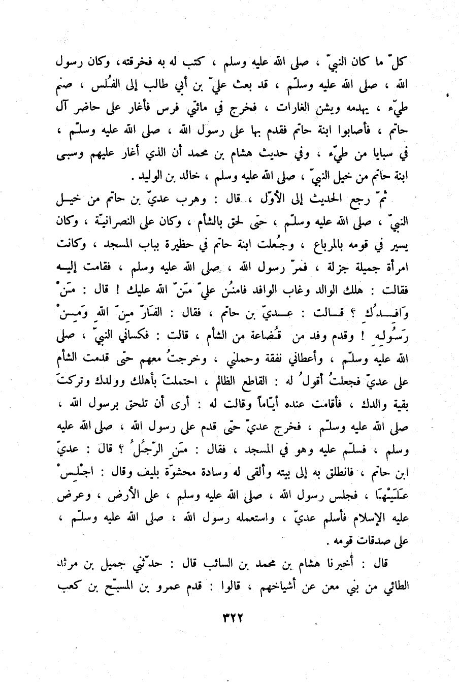 قَالَ: أَخْبَرَنَا هِشَامُ بْنُ مُحَمَّدِ بْنِ السَّائِبِ قَالَ: حَدَّثَنِي جَمِيلُ بْنُ مَرْثَدٍ الطَّائِيُّ، مِنْ بَنِي مَعْنٍ عَنْ أَشْيَاخِهِمْ، قَالُوا: قَدِمَ عَمْرُو بْنُ الْمُسَبِّحِ بْنِ كَعْبِ -[323]- بْنِ عَمْرِو بْنِ عَصْرِ بْنِ غَنْمِ بْنِ حَارِثَةَ بْنِ ثَوْبِ بْنِ مَعْنٍ الطَّائِيُّ عَلَى النَّبِيِّ صلّى الله عليه وسلم وَهُوَ يَوْمَئِذٍ ابْنُ مِائَةٍ وَخَمْسِينَ سَنَةً فَسَأَلَهُ عَنِ الصَّيْدِ، فَقَالَ: «§كُلْ مَا أَصْمَيْتَ وَدَعْ مَا أَنْمَيْتَ» وَهُوَ الَّذِي يَقُولُ لَهُ امْرُؤُ الْقَيْسِ بْنُ حَجَرِ وَكَانَ أَرْمَى الْعَرَبِ: