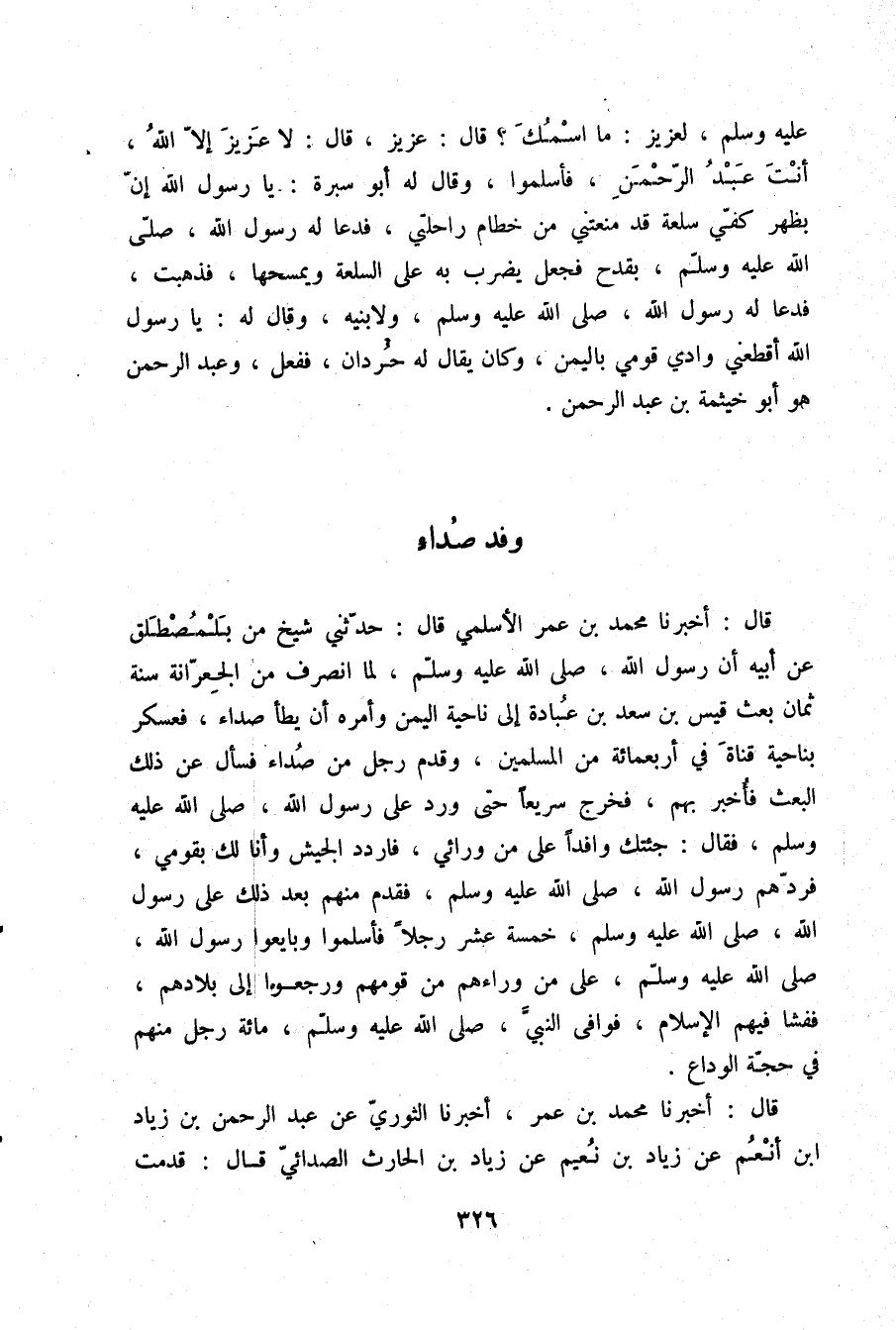 قَالَ: أَخْبَرَنَا مُحَمَّدُ بْنُ عُمَرَ الْأَسْلَمِيُّ قَالَ: حَدَّثَنِي شَيْخٌ مِنْ بَلْمُصْطَلِقَ عَنْ أَبِيهِ، " أَنَّ رَسُولَ اللَّهِ صلّى الله عليه وسلم §لَمَّا انْصَرَفَ مِنَ الْجِعْرَانَةِ سَنَةَ ثَمَانٍ بَعَثَ قَيْسَ بْنَ سَعْدِ بْنَ عُبَادَةَ إِلَى نَاحِيَةِ الْيَمَنِ وَأَمَرَهُ أَنْ يَطَأَ صُدَاءَ فَعَسْكَرَ بِنَاحِيَةِ قَنَاةَ فِي أَرْبَعِمِائَةٍ مِنَ الْمُسْلِمِينَ، وَقَدِمَ رَجُلٌ مِنْ صُدَاءَ فَسَأَلَ عَنْ ذَلِكَ الْبَعْثِ فَأُخْبِرَ بِهِمْ، فَخَرَجَ سَرِيعًا حَتَّى وَرَدَ عَلَى رَسُولِ اللَّهِ صلّى الله عليه وسلم، فَقَالَ: جِئْتُكَ وَافِدًا عَلَى مَنْ وَرَائِي فَارْدُدِ الْجَيْشَ وَأَنَا لَكَ بِقَوْمِي، فَرَدَّهُمْ رَسُولُ اللَّهِ صلّى الله عليه وسلم فَقَدِمَ مِنْهُمْ بَعْدَ ذَلِكَ عَلَى رَسُولِ اللَّهِ صلّى الله عليه وسلم خَمْسَةَ عَشَرَ رَجُلًا، فَأَسْلَمُوا وَبَايَعُوا رَسُولَ اللَّهِ صلّى الله عليه وسلم عَلَى مَنْ وَرَاءَهُمْ مِنْ قَوْمِهِمْ وَرَجَعُوا إِلَى بِلَادِهِمْ فَفَشَا فِيهِمُ الْإِسْلَامُ فَوَافَى النَّبِيَّ صلّى الله عليه وسلم مِائَةُ رَجُلٍ مِنْهُمْ فِي حَجَّةِ الْوَدَاعِ