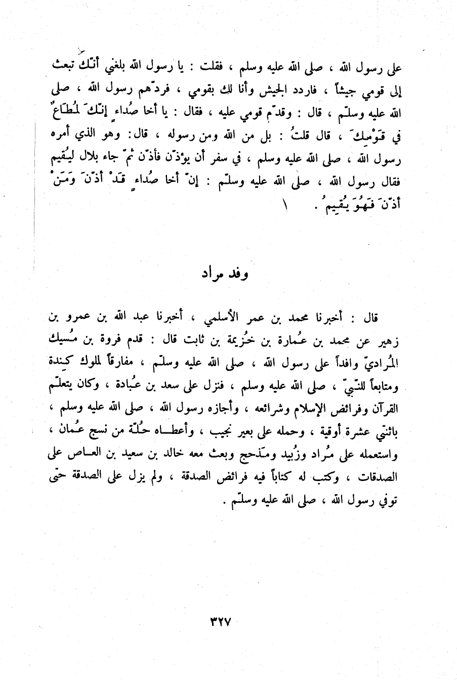 قَالَ: أَخْبَرَنَا مُحَمَّدُ بْنُ عُمَرَ الْأَسْلَمِيُّ، أَخْبَرَنَا عَبْدُ اللَّهِ بْنُ عَمْرِو بْنِ زُهَيْرٍ، عَنْ مُحَمَّدِ بْنِ عُمَارَةَ بْنِ خُزَيْمَةَ بْنِ ثَابِتٍ قَالَ: قَدِمَ فَرْوَةُ بْنُ مُسَيْكٍ الْمُرَادِيُّ وَافِدًا عَلَى رَسُولِ اللَّهِ صلّى الله عليه وسلم مُفَارِقًا لِمُلُوكِ كِنْدَةَ وَمُتَابِعًا لِلنَّبِيِّ صلّى الله عليه وسلم فَنَزَلَ عَلَى سَعْدِ بْنِ عُبَادَةَ وَكَانَ يَتَعَلَّمُ الْقُرْآنَ وَفَرَائِضَ الْإِسْلَامِ وَشَرَائِعَهُ، §وَأَجَازَهُ رَسُولُ اللَّهِ صلّى الله عليه وسلم بِاثْنَتَيْ عَشْرَةَ أُوقِيَّةً وَحَمَلَهُ عَلَى بَعِيرٍ نَجِيبٍ وَأَعْطَاهُ حُلَّةً مِنْ نَسْجِ عُمَانَ، وَاسْتَعْمَلَهُ عَلَى مُرَادٍ وَزُبَيْدٍ وَمَذْحِجٍ وَبَعَثَ مَعَهُ خَالِدَ بْنَ سَعِيدِ بْنِ الْعَاصِ عَلَى الصَّدَقَاتِ وَكَتَبَ لَهُ كِتَابًا فِيهِ فَرَائِضُ الصَّدَقَةِ، وَلَمْ يَزَلْ عَلَى الصَّدَقَةِ حَتَّى تُوُفِّيَ رَسُولُ اللَّهِ صلّى الله عليه وسلم