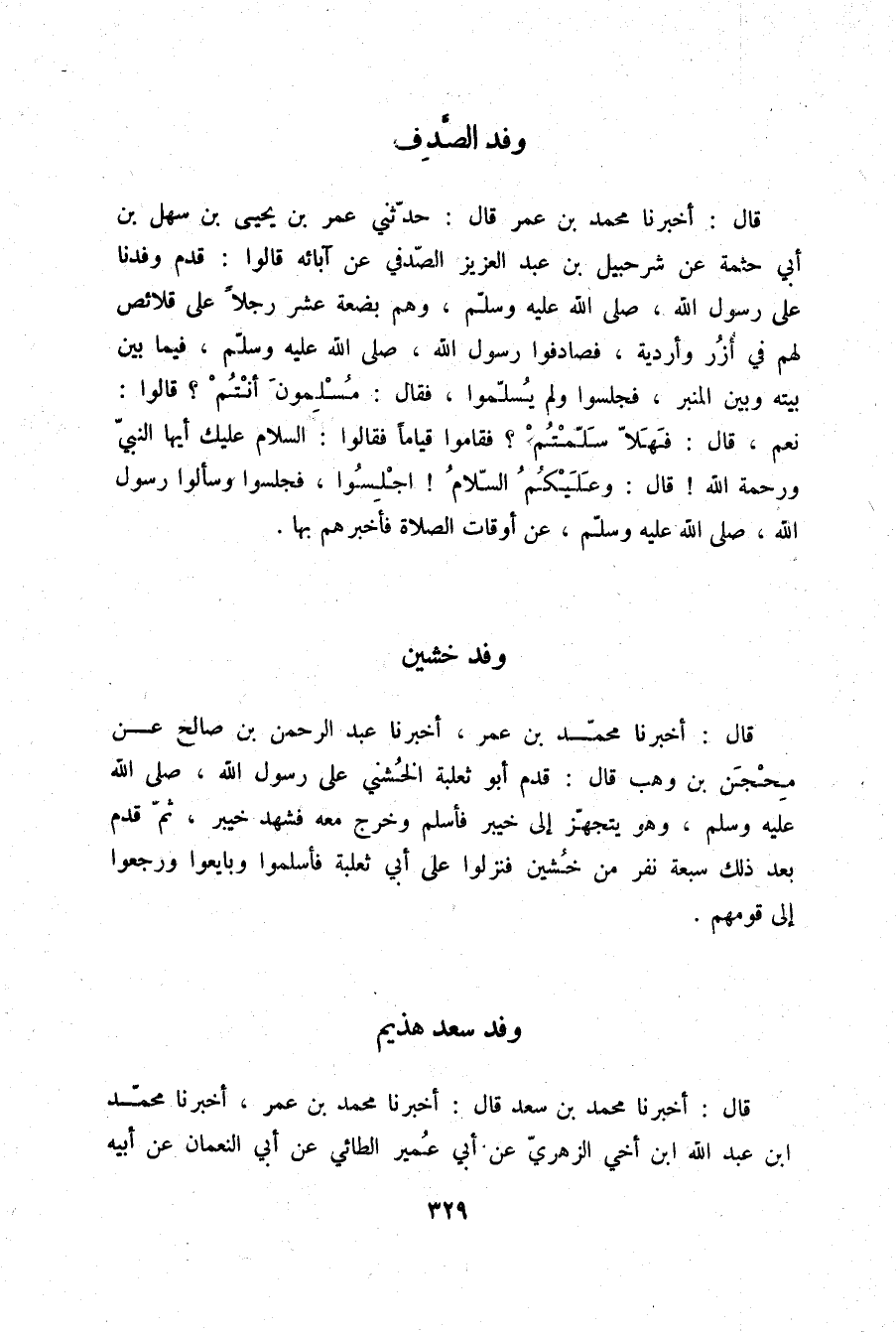 قَالَ: أَخْبَرَنَا مُحَمَّدُ بْنُ عُمَرَ قَالَ: حَدَّثَنِي عُمَرُ بْنُ يَحْيَى بْنِ سَهْلِ بْنِ أَبِي حَثْمَةَ، عَنْ شُرَحْبِيلَ بْنِ عَبْدِ الْعَزِيزِ الصَّدَفِيِّ، عَنْ آبَائِهِ، قَالُوا: قَدِمَ وَفْدُنَا عَلَى رَسُولِ اللَّهِ صلّى الله عليه وسلم وَهُمْ بَضْعَةَ عَشَرَ رَجُلًا عَلَى قَلَائِصَ لَهُمْ فِي أُزُرٍ وَأَرْدِيَةٍ فَصَادَفُوا رَسُولَ اللَّهِ صلّى الله عليه وسلم فِيمَا بَيْنَ بَيْتِهِ وَبَيْنَ الْمِنْبَرِ فَجَلَسُوا وَلَمْ يُسَلِّمُوا فَقَالَ: «§مُسْلِمُونَ أَنْتُمْ؟» قَالُوا: نَعَمْ، قَالَ: فَهَلَّا سَلَّمْتُمْ، فَقَامُوا قِيَامًا، فَقَالُوا: السَّلَامُ عَلَيْكَ أَيُّهَا النَّبِيُّ وَرَحْمَةُ اللَّهِ قَالَ: «وَعَلَيْكُمُ السَّلَامُ اجْلِسُوا» فَجَلَسُوا وَسَأَلُوا رَسُولَ اللَّهِ صلّى الله عليه وسلم عَنْ أَوْقَاتِ الصَّلَاةِ فَأَخْبَرَهُمْ بِهَا