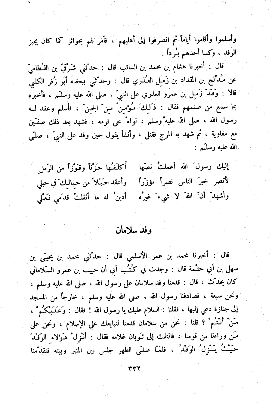 قَالَ: أَخْبَرَنَا مُحَمَّدُ بْنُ عُمَرَ الْأَسْلَمِيُّ قَالَ: حَدَّثَنِي مُحَمَّدُ بْنُ يَحْيَى بْنِ سَهْلِ بْنِ أَبِي حَثْمَةَ قَالَ: وَجَدْتُ فِي كُتُبِ أَبِي: أَنَّ حَبِيبَ بْنَ عَمْرٍو السَّلَامَانِيَّ، كَانَ يُحَدِّثُ قَالَ: قَدِمْنَا وَفْدَ سَلَامَانَ عَلَى رَسُولِ اللَّهِ صلّى الله عليه وسلم وَنَحْنُ سَبْعَةٌ فَصَادَفْنَا رَسُولَ اللَّهِ صلّى الله عليه وسلم خَارِجًا مِنَ الْمَسْجِدِ إِلَى جَنَازَةٍ دُعِيَ إِلَيْهَا فَقُلْنَا: السَّلَامُ عَلَيْكَ يَا رَسُولَ اللَّهِ، فَقَالَ: «وَعَلَيْكُمْ، مَنْ أَنْتُمْ؟» قُلْنَا: نَحْنُ مِنْ سَلَامَانَ قَدِمْنَا لِنُبَايِعَكَ عَلَى الْإِسْلَامِ وَنَحْنُ عَلَى مَنْ وَرَاءَنَا مِنْ قَوْمِنَا فَالْتَفَتَ إِلَى ثَوْبَانَ غُلَامِهِ، فَقَالَ: «§أَنْزِلْ هَؤُلَاءِ الْوَفْدَ حَيْثُ يَنْزِلُ الْوَفْدُ» فَلَمَّا صَلَّى الظُّهْرَ جَلَسَ بَيْنَ الْمِنْبَرِ وَبَيْتِهِ فَتَقَدَّمْنَا -[333]- إِلَيْهِ فَسَأَلْنَاهُ عَنْ أَمْرِ الصَّلَاةِ وَشَرَائِعِ الْإِسْلَامِ وَعَنِ الرُّقَى وَأَسْلَمْنَا وَأَعْطَى كُلَّ رَجُلٍ مِنَّا خَمْسَ أَوَاقٍ وَرَجَعْنَا إِلَى بِلَادِنَا، وَذَلِكَ فِي شَوَّالٍ سَنَةَ عَشْرٍ