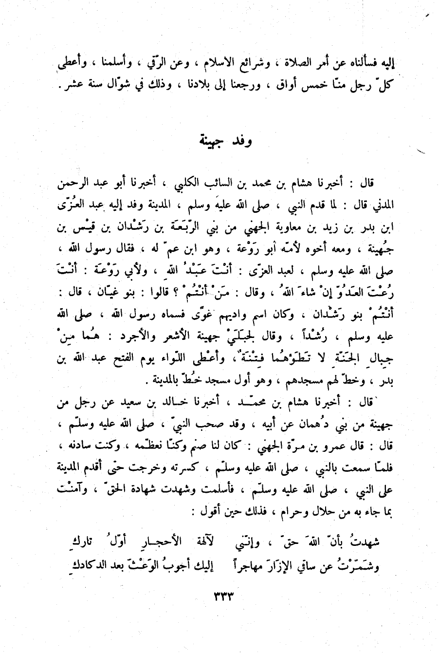 قَالَ: أَخْبَرَنَا هِشَامُ بْنُ مُحَمَّدِ بْنِ السَّائِبِ الْكَلْبِيُّ، أَخْبَرَنَا أَبُو عَبْدِ الرَّحْمَنِ الْمَدَنِيُّ قَالَ: لَمَّا قَدِمَ النَّبِيُّ صلّى الله عليه وسلم الْمَدِينَةَ وَفَدَ إِلَيْهِ عَبْدُ الْعُزَّى بْنُ بَدْرِ بْنِ زَيْدِ بْنِ مُعَاوِيَةَ الْجُهَنِيُّ مِنْ بَنِي الرَّبْعَةِ بْنِ رَشْدَانَ بْنِ قَيْسِ بْنِ جُهَيْنَةَ وَمَعَهُ أَخُوهُ لِأُمِّهِ أَبُو رَوْعَةَ وَهُوَ ابْنُ عَمٍّ لَهُ، فَقَالَ رَسُولُ اللَّهِ صلّى الله عليه وسلم لعَبْدِ الْعُزَّى: «§أَنْتَ عَبْدُ اللَّهِ وَلِأَبِي رَوْعَةَ أَنْتَ رَعْتَ الْعَدُوَّ إِنْ شَاءَ اللَّهُ» وَقَالَ: «مَنْ أَنْتُمْ؟» قَالُوا: بَنُو غَيَّانَ قَالَ: «أَنْتُمْ بَنُو رَشْدَانَ» وَكَانَ اسْمُ وَادِيهِمْ غَوًى فَسَمَّاهُ رَسُولُ اللَّهِ صلّى الله عليه وسلم رُشْدًا وَقَالَ لِجَبَلَيْ جُهَيْنَةَ الْأَشْعَرِ وَالْأَجْرَدِ: «هُمَا مِنْ جِبَالِ الْجَنَّةِ لَا تَطَؤُهُمَا فِتْنَةٌ» وَأَعْطَى اللِّوَاءَ يَوْمَ الْفَتْحِ عَبْدَ اللَّهِ بْنَ بَدْرِ وَخَطَّ لَهُمْ مَسْجِدَهُمْ وَهُوَ أَوَّلُ مَسْجِدٍ خُطَّ بِالْمَدِينَةِ