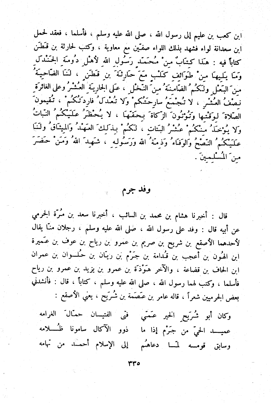 قَالَ: أَخْبَرَنَا هِشَامُ بْنُ مُحَمَّدِ بْنِ السَّائِبِ، أَخْبَرَنَا سَعْدُ بْنُ مُرَّةَ الْجَرْمِيُّ، عَنْ أَبِيهِ قَالَ: وَفَدَ عَلَى رَسُولِ اللَّهِ صلّى الله عليه وسلم رَجُلَانِ مِنَّا يُقَالُ لِأَحَدِهِمَا: الْأَصْقَعُ بْنُ شُرَيْحِ بْنِ صُرَيْمِ بْنِ عَمْرِو بْنِ رِيَاحِ بْنِ عَوْفِ بْنِ عَمِيرَةَ بْنِ الْهُونِ بْنِ أَعْجَبَ بْنِ قُدَامَةَ بْنِ جُرْمِ بْنِ رَيَّانَ بْنِ حُلْوَانَ بْنِ عِمْرَانَ بْنِ الْحَافِ بْنِ قُضَاعَةَ وَالْآخَرُ هَوْذَةُ بْنُ عَمْرِو بْنِ يَزِيْدَ بْنِ عَمْرِو بْنِ رِيَاحٍ §فَأَسْلَمَا وَكَتَبَ لَهُمَا رَسُولُ اللَّهِ صلّى الله عليه وسلم كِتَابًا قَالَ: فَأَنْشَدَنِي بَعْضُ الْجَرْمِيِّينَ شِعْرًا قَالَهُ عَامِرُ بْنُ عِصْمَةَ بْنِ شُرَيْحٍ يَعْنِي الْأَصْقَعَ: