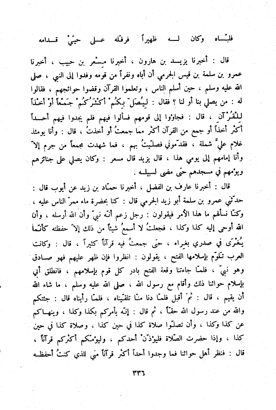قَالَ: أَخْبَرَنَا عَارِمُ بْنُ الْفَضْلِ، أَخْبَرَنَا حَمَّادُ بْنُ زَيْدٍ، عَنْ أَيُّوبَ قَالَ: حَدَّثَنِي عَمْرُو بْنُ سَلَمَةَ أَبُو زَيْدٍ الْجَرْمِيُّ قَالَ: كُنَّا بِحَضْرَةِ مَاءٍ، مَمَرُّ النَّاسِ عَلَيْهِ وَكُنَّا نَسْأَلُهُمْ مَا هَذَا الْأَمْرُ؟ فَيَقُولُونَ: رَجُلٌ زَعَمَ أَنَّهُ نَبِيٌّ، وَأَنَّ اللَّهَ أَرْسَلَهُ، وَأَنَّ اللَّهَ أَوْحَى إِلَيْهِ كَذَا وَكَذَا، فَجَعَلْتُ لَا أَسْمَعُ شَيْئًا مِنْ ذَلِكَ إِلَّا حَفِظْتُهُ كَأَنَّمَا يُغْرَى فِي صَدْرِي بِغِرَاءٍ حَتَّى جَمَعْتُ فِيهِ قُرْآنًا كَثِيرًا قَالَ: وَكَانَتِ الْعَرَبُ تَلَوَّمُ بِإِسْلَامِهَا الْفَتْحَ، يَقُولُونَ: انْظُرُوا فَإِنْ ظَهَرَ عَلَيْهِمْ فَهُوَ صَادِقٌ وَهُوَ نَبِيٌّ، فَلَمَّا جَاءَتْنَا وَقْعَةُ الْفَتْحِ بَادَرَ كُلُّ قَوْمٍ بِإِسْلَامِهِمْ فَانْطَلَقَ أَبِي بِإِسْلَامِ حِوَائِنَا ذَلِكَ، وَأَقَامَ مَعَ رَسُولِ اللَّهِ صلّى الله عليه وسلم مَا شَاءَ اللَّهُ أَنْ يُقِيمَ قَالَ: ثُمَّ أَقْبَلَ، فَلَمَّا دَنَا مِنَّا تَلَقَّيْنَاهُ، فَلَمَّا رَأَيْنَاهُ قَالَ: جِئْتُكُمْ وَاللَّهِ مِنْ عِنْدِ رَسُولِ اللَّهِ حَقًّا، ثُمَّ قَالَ: إِنَّهُ §يَأْمُرُكُمْ بِكَذَا وَكَذَا وَيَنْهَاكُمْ عَنْ كَذَا وَكَذَا، وَأَنْ تُصَلُّوا صَلَاةَ كَذَا فِي حِينِ كَذَا، وَصَلَاةَ كَذَا فِي حِينِ كَذَا، وَإِذَا حَضَرَتِ الصَّلَاةُ فَلْيُؤَذِّنْ أَحَدُكُمْ وَلْيَؤُمَّكُمْ أَكْثَرُكُمْ قُرْآنًا قَالَ: فَنَظَرَ أَهْلُ حِوَائِنَا فَمَا وَجَدُوا أَحَدًا أَكْثَرَ قُرْآنًا مِنِّي لِلَّذِي كُنْتُ أَحْفَظُهُ -[337]- مِنَ الرُّكْبَانِ، قَالَ: فَقَدَّمُونِي بَيْنَ أَيْدِيهِمْ فَكُنْتُ أُصَلِّي بِهِمْ، وَأَنَا ابْنُ سِتِّ سِنِينَ، قَالَ: وَكَانَ عَلَيَّ بُرْدَةٌ كُنْتُ إِذَا سَجَدْتُ تَقَلَّصَتْ عَنِّي، فَقَالَتِ امْرَأَةٌ مِنَ الْحَيِّ: أَلَا تُغَطُّونَ عَنَّا اسْتَ قَارِئِكُمْ، قَالَ: فَكَسُونِي قَمِيصًا مِنْ مَعْقَدِ الْبَحْرَيْنِ قَالَ: فَمَا فَرِحْتُ بِشَيْءٍ أَشَدَّ مِنْ فَرَحِي بِذَلِكَ الْقَمِيصِ