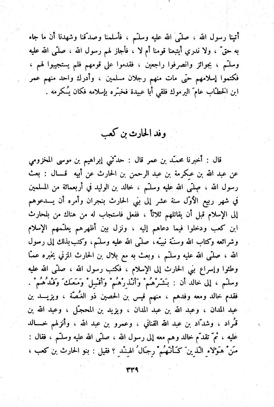 قَالَ: أَخْبَرَنَا مُحَمَّدُ بْنُ عُمَرَ قَالَ: حَدَّثَنِي إِبْرَاهِيمُ بْنُ مُوسَى الْمَخْزُومِيُّ، عَنْ عَبْدِ اللَّهِ بْنِ عِكْرِمَةَ بْنِ عَبْدِ الرَّحْمَنِ بْنِ الْحَارِثِ، عَنْ أَبِيهِ قَالَ: بَعَثَ رَسُولُ اللَّهِ صلّى الله عليه وسلم خَالِدَ بْنَ الْوَلِيدِ فِي أَرْبَعِمِائَةٍ مِنَ الْمُسْلِمِينَ فِي شَهْرِ رَبِيعٍ الْأَوَّلِ سَنَةَ عَشْرٍ إِلَى بَنِي الْحَارِثِ بِنَجْرَانَ وَأَمَرَهُ أَنْ يَدْعُوهُمْ إِلَى الْإِسْلَامِ قَبْلَ أَنْ يُقَاتِلَهُمْ ثَلَاثًا فَفَعَلَ فَاسْتَجَابَ لَهُ مَنْ هُنَاكَ مِنْ بَلْحَارِثِ بْنِ كَعْبٍ وَدَخَلُوا فِيمَا دَعَاهُمْ إِلَيْهِ وَنَزَلَ بَيْنَ أَظْهُرِهِمْ يُعَلِّمُهُمُ الْإِسْلَامَ وَشَرَائِعَهُ وَكِتَابَ اللَّهِ وَسُنَّةَ نَبِيِّهِ صلّى الله عليه وسلم وَكَتَبَ بِذَلِكَ إِلَى رَسُولِ اللَّهِ صلّى الله عليه وسلم وَبَعَثَ بِهِ مَعَ بِلَالِ بْنِ الْحَارِثِ الْمُزَنِيِّ يُخْبِرُهُ عَمَّا وَطِئُوا وَإِسْرَاعِ بَنِي الْحَارِثِ إِلَى الْإِسْلَامِ فَكَتَبَ رَسُولُ اللَّهِ صلّى الله عليه وسلم إِلَى خَالِدٍ أَنْ بَشِّرْهُمْ وَأَنْذِرْهُمْ وَأَقْبِلْ وَمَعَكَ وَفْدُهُمْ، فَقَدِمَ خَالِدٌ وَمَعَهُ وَفْدُهُمْ، مِنْهُمْ قَيْسُ بْنُ الْحُصَيْنِ ذُو الْغُصَّةِ وَيَزِيدُ بْنُ عَبْدِ الْمَدَانِ وَعَبْدُ اللَّهِ بْنُ عَبْدِ الْمَدَانِ وَيَزِيدُ بْنُ الْمُحَجَّلِ وَعَبْدُ اللَّهِ بْنُ قُرَادٍ وَشَدَّادُ بْنُ عَبْدِ اللَّهِ الْقَنَانِيُّ وَعَمْرُو بْنُ عَبْدِ اللَّهِ وَأَنْزَلَهُمْ خَالِدٌ عَلَيْهِ، ثُمَّ تَقَدَّمَ خَالِدٌ وَهُمْ مَعَهُ إِلَى رَسُولِ اللَّهِ صلّى الله عليه وسلم فَقَالَ: «§مَنْ هَؤُلَاءِ الَّذِينَ كَأَنَّهُمْ رِجَالُ الْهِنْدِ؟» فَقِيلَ: بَنُو الْحَارِثِ بْنِ كَعْبٍ