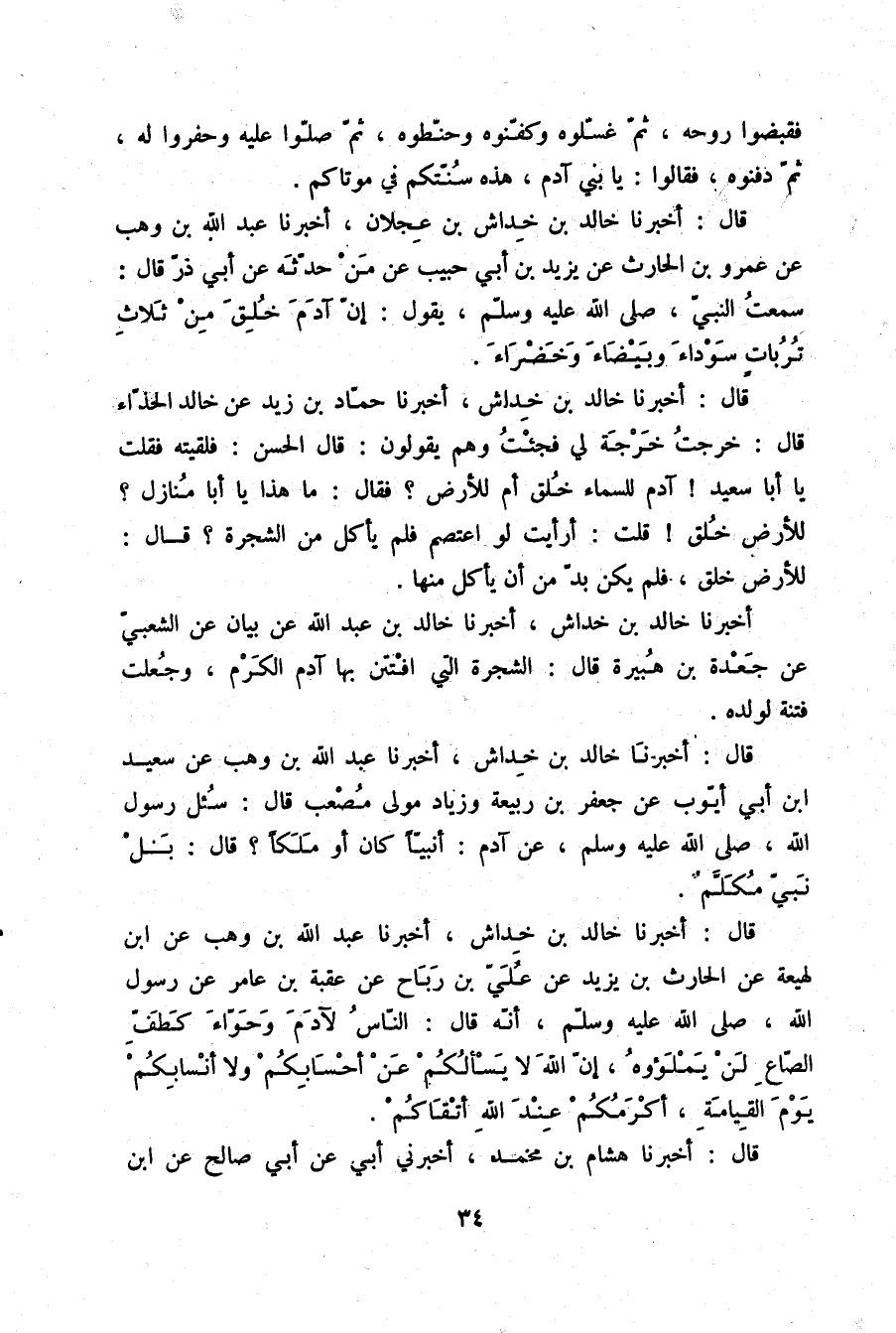 قَالَ: أَخْبَرَنَا خَالِدُ بْنُ خِدَاشٍ، أَخْبَرَنَا عَبْدُ اللَّهِ بْنُ وَهْبٍ، عَنْ سَعِيدِ بْنِ أَبِي أَيُّوبَ، عَنْ جَعْفَرِ بْنِ رَبِيعَةَ، وَزِيَادٍ، مَوْلَى مُصْعَبٍ قَالَ: سُئِلَ رَسُولُ اللَّهِ صلّى الله عليه وسلم عَنْ §آدَمَ أَنَبِيًّا كَانَ أَوْ مَلَكًا؟ قَالَ: «بَلْ نَبِيٌّ مُكَلَّمٌ»