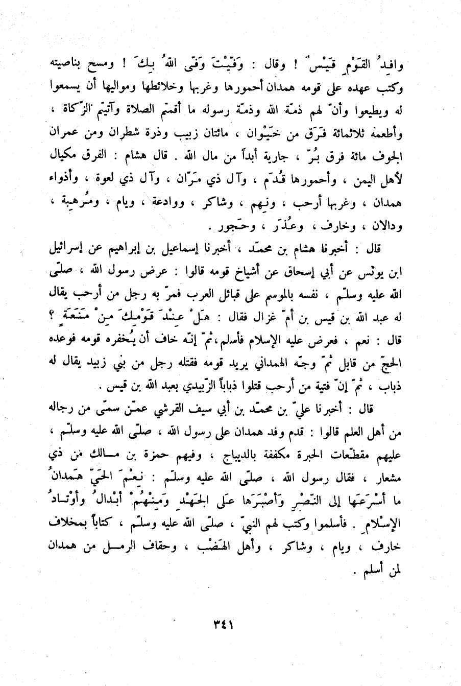 قَالَ: أَخْبَرَنَا عَلِيُّ بْنُ مُحَمَّدِ بْنِ أَبِي سَيْفٍ الْقُرَشِيُّ، عَمَّنْ سَمَّى مِنْ رِجَالِهِ مِنْ أَهْلِ الْعِلْمِ قَالُوا: قَدِمَ وَفْدُ هَمْدَانَ عَلَى رَسُولِ اللَّهِ صلّى الله عليه وسلم عَلَيْهِمْ مُقَطَّعَاتُ الْحِبَرَةِ مُكَفَّفَةٌ بِالدِّيبَاجِ، وَفِيهِمْ حَمْزَةُ بْنُ مَالِكٍ مِنْ ذِي مِشْعَارٍ، فَقَالَ رَسُولُ اللَّهِ صلّى الله عليه وسلم: «§نِعْمَ الْحَيُّ هَمْدَانُ مَا أَسْرَعَهَا إِلَى النَّصْرِ وَأَصْبَرَهَا عَلَى الْجَهْدِ، وَمِنْهُمْ أَبْدَالُ وَأَوْتَادُ الْإِسْلَامِ» فَأَسْلَمُوا وَكَتَبَ لَهُمُ النَّبِيُّ صلّى الله عليه وسلم كِتَابًا بِمِخْلَافِ خَارِفٍ وَيَامٍ وَشَاكِرٍ وَأَهْلِ الْهَضْبِ وَحِقَافِ الرَّمْلِ مِنْ هَمْدَانَ لِمَنْ أَسْلَمَ