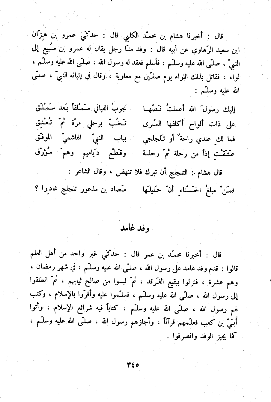 قَالَ: أَخْبَرَنَا مُحَمَّدُ بْنُ عُمَرَ قَالَ: حَدَّثَنِي غَيْرُ وَاحِدٍ مِنْ أَهْلِ الْعِلْمِ، قَالُوا: قَدِمَ وَفْدُ غَامِدٍ عَلَى رَسُولِ اللَّهِ صلّى الله عليه وسلم فِي شَهْرِ رَمَضَانَ وَهُمْ عَشَرَةٌ فَنَزَلُوا بِبَقِيعِ الْغَرْقَدِ، ثُمَّ لَبِسُوا مِنْ صَالِحِ ثِيَابِهِمْ، ثُمَّ انْطَلَقُوا إِلَى رَسُولِ اللَّهِ صلّى الله عليه وسلم فَسَلَّمُوا عَلَيْهِ وَأَقَرُّوا بِالْإِسْلَامِ، §وَكَتَبَ لَهُمْ رَسُولُ اللَّهِ صلّى الله عليه وسلم كِتَابًا فِيهِ شَرَائِعُ الْإِسْلَامِ وَأَتَوْا أُبَيَّ بْنَ كَعْبٍ فَعَلَّمَهُمْ قُرْآنًا وَأَجَازَهُمْ رَسُولُ اللَّهِ صلّى الله عليه وسلم كَمَا يُجِيزُ الْوَفْدَ وَانْصَرَفُوا