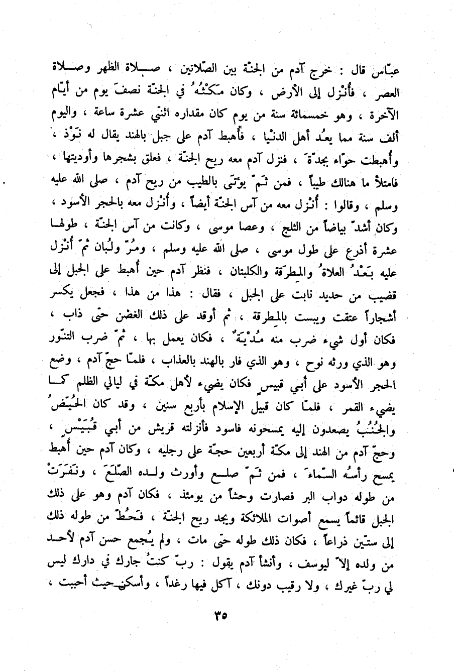 عَبَّاسٍ قَالَ: " §خَرَجَ آدَمُ مِنَ الْجَنَّةِ بَيْنَ الصَّلَاتَيْنِ صَلَاةِ الظُّهْرِ وَصَلَاةِ الْعَصْرِ فَأُنْزِلَ إِلَى الْأَرْضِ وَكَانَ مُكْثُهُ فِي الْجَنَّةِ نِصْفَ يَوْمٍ مِنْ أَيَّامِ الْآخِرَةِ وَهُوَ خَمْسُمِائَةِ سَنَةٍ مِنْ يَوْمٍ كَانَ مِقْدَارُهُ اثْنَتَيْ عَشْرَةَ سَاعَةً وَالْيَوْمُ أَلْفُ سَنَةٍ مِمَّا يَعُدُّ أَهْلُ الدُّنْيَا فَأُهْبِطَ آدَمُ عَلَى جَبَلٍ بِالْهِنْدِ يُقَالُ لَهُ: نَوْذُ وَأُهْبِطَتْ حَوَّاءُ بِجَدَّةَ فَنَزَلَ آدَمُ مَعَهُ رِيحُ الْجَنَّةِ فَعَلِقَ بِشَجَرِهَا وَأَوْدِيَتِهَا فَامْتَلَأَ مَا هُنَالِكَ طِيبًا فَمِنْ ثَمَّ يُؤْتَى بِالطِّيبِ مِنْ رِيحِ آدَمَ صلّى الله عليه وسلم وَقَالُوا: أُنْزِلَ مَعَهُ مِنْ آسِ الْجَنَّةِ أَيْضًا وَأُنْزِلَ مَعَهُ بِالْحَجَرِ الْأَسْوَدِ وَكَانَ أَشَدَّ بَيَاضًا مِنَ الثَّلْجِ وَعَصَا مُوسَى وَكَانَتْ مِنْ آسِ الْجَنَّةِ طُولُهَا عَشَرَةُ أَذْرُعٍ عَلَى طُولِ مُوسَى صلّى الله عليه وسلم وَمَرٌّ وَلُبَانٌ ثُمَّ أُنْزِلَ عَلَيْهِ بَعْدُ الْعَلَاةُ وَالْمِطْرَقَةُ وَالْكَلْبَتَانِ فَنَظَرَ آدَمُ حِينَ أُهْبِطَ عَلَى الْجَبَلِ إِلَى قَضِيبٍ مِنْ حَدِيدٍ نَابِتٍ عَلَى الْجَبَلِ فَقَالَ: هَذَا مِنْ هَذَا فَجَعَلَ يُكَسِّرُ أَشْجَارًا عَتَقَتْ وَيَبَسَتْ بِالْمِطْرَقَةِ ثُمَّ أَوَقَدْ عَلَى ذَلِكَ الْغُصْنِ حَتَّى ذَابَ فَكَانَ أَوَّلُ شَيْءٍ ضُرِبَ مِنْهُ مُدْيَةٌ فَكَانَ يَعْمَلُ بِهَا ثُمَّ ضُرِبَ التَّنُّورُ وَهُوَ الَّذِي وَرِثَهُ نُوحٌ وَهُوَ الَّذِي فَارَ بِالْهِنْدِ بِالْعَذَابِ فَلَمَّا حَجَّ آدَمُ وَضَعَ الْحَجَرَ الْأَسْوَدَ عَلَى أَبِي قُبَيْسٍ فَكَانَ يُضِيءُ لِأَهْلِ مَكَّةَ فِي لَيَالِي الظُّلَمِ كَمَا يُضِيءُ الْقَمَرُ فَلَمَّا كَانَ قُبَيْلَ الْإِسْلَامِ بِأَرْبَعِ سِنِينَ وَقَدْ كَانَ الْحُيَّضُ وَالْجُنُبُ يَصْعَدُونَ إِلَيْهِ يَمْسَحُونَهُ فَاسْوَدَّ فَأَنْزَلَتْهُ قُرَيْشٌ مِنْ أَبِي قُبَيْسٍ وَحَجَّ آدَمُ مِنَ الْهِنْدِ إِلَى مَكَّةَ أَرْبَعِينَ حَجَّةً عَلَى رِجْلَيْهِ وَكَانَ آدَمُ حِينَ أُهْبِطَ يَمْسَحُ رَأْسُهُ السَّمَاءَ فَمِنْ ثَمَّ صَلُعَ وَأَوْرَثَ وَلَدَهُ الصَّلَعَ وَنَفَرَتْ مِنْ طُولِهِ دَوَابُّ الْبَرِّ فَصَارَتْ وَحْشًا مِنْ يَوْمَئِذٍ فَكَانَ آدَمُ وَهُوَ عَلَى ذَلِكَ الْجَبَلِ قَائِمًا يَسْمَعُ أَصْوَاتَ الْمَلَائِكَةِ وَيَجِدُ رِيحَ الْجَنَّةِ فَحُطَّ مِنْ طُولِهِ ذَلِكَ إِلَى سِتِّينَ ذِرَاعًا فَكَانَ ذَلِكَ طُولُهُ حَتَّى مَاتَ وَلَمْ يُجْمَعْ حُسْنُ آدَمَ لِأَحَدٍ مِنْ وَلَدِهِ إِلَّا لِيُوسُفَ وَأَنْشَأَ آدَمُ يَقُولُ: رَبِّ كُنْتُ جَارَكَ فِي دَارِكَ لَيْسَ لِي رَبٌّ غَيْرَكَ وَلَا رَقِيبٌ دُونَكَ آكُلُ فِيهَا رَغَدًا وَأَسْكُنُ حَيْثُ أَحْبَبْتُ