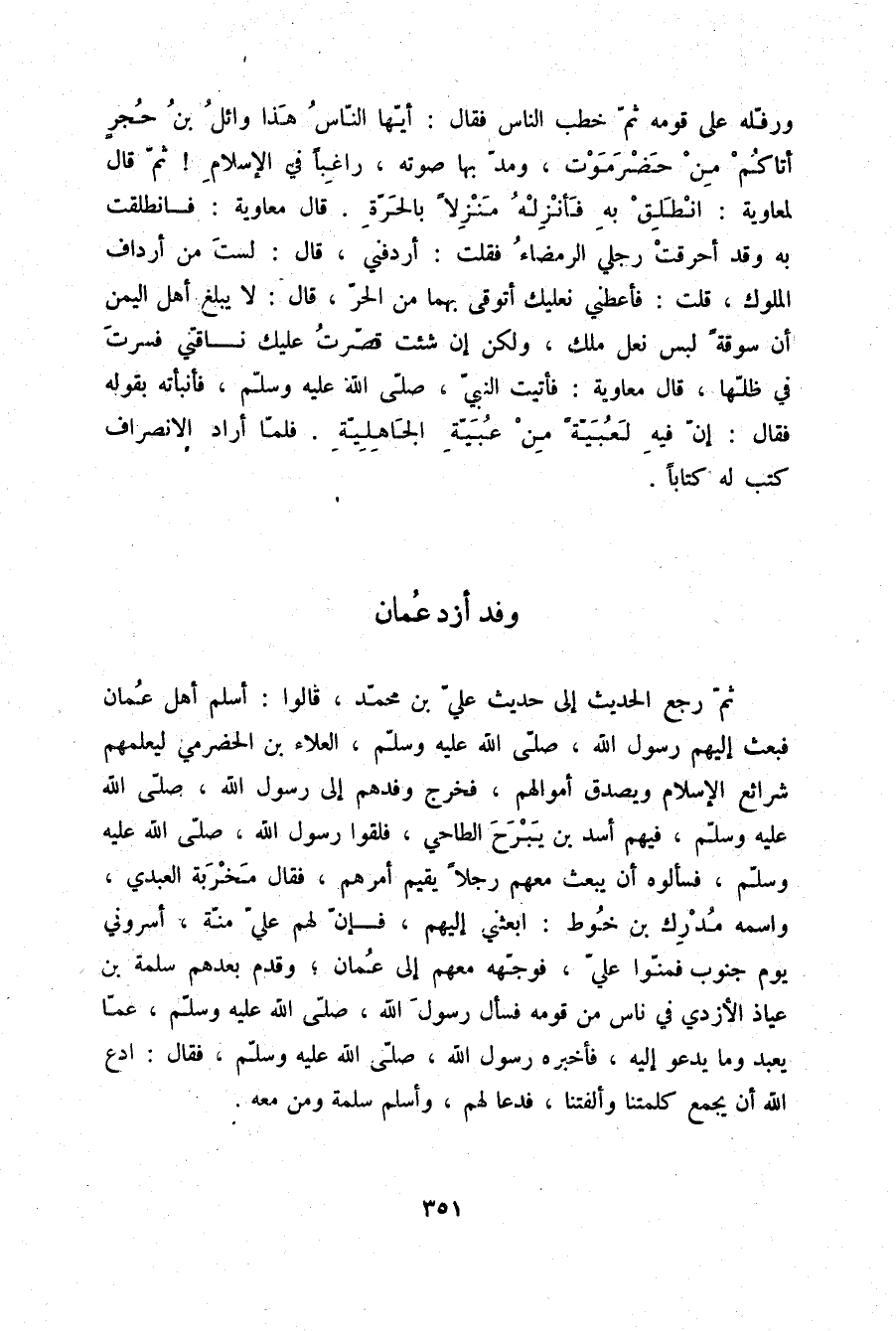 §وَفْدُ أَزْدِ عُمَانَ ثُمَّ رَجَعَ الْحَدِيثُ إِلَى حَدِيثِ عَلِيِّ بْنِ مُحَمَّدٍ، قَالُوا: أَسْلَمَ أَهْلُ عُمَانَ فَبَعَثَ إِلَيْهِمْ رَسُولُ اللَّهِ صلّى الله عليه وسلم الْعَلَاءَ بْنَ الْحَضْرَمِيِّ لِيُعَلِّمَهُمْ شَرَائِعَ الْإِسْلَامِ وَيَصْدُقَ أَمْوَالَهُمْ، فَخَرَجَ وَفْدُهُمْ إِلَى رَسُولِ اللَّهِ صلّى الله عليه وسلم فِيهِمْ أَسَدُ بْنُ يَبْرَحَ الطَّاحِيُّ فَلَقُوا رَسُولَ اللَّهِ صلّى الله عليه وسلم فَسَأَلُوهُ أَنْ يَبْعَثَ مَعَهُمْ رَجُلًا يُقِيمُ أَمْرَهُمْ، فَقَالَ مُخَرِّبَةُ الْعَبْدِيُّ وَاسْمُهُ مُدْرِكُ بْنُ خُوطٍ: ابْعَثْنِي إِلَيْهِمْ فَإِنَّ لَهُمْ عَلَيَّ مِنَّةً أَسَرُونِي يَوْمَ جَنُوبٍ فَمَنُّوا عَلَيَّ، فَوَجَّهَهُ مَعَهُمْ إِلَى عُمَانَ، وَقَدِمَ بَعْدَهُمْ سَلَمَةُ بْنُ عِيَاذٍ الْأَزْدِيُّ فِي نَاسٍ مِنْ قَوْمِهِ، فَسَأَلَ رَسُولَ اللَّهِ صلّى الله عليه وسلم عَمَّا يَعْبُدُ وَمَا يَدْعُو إِلَيْهِ، فَأَخْبَرَهُ رَسُولُ اللَّهِ صلّى الله عليه وسلم فَقَالَ: ادْعُ اللَّهَ أَنْ يَجْمَعَ كَلِمَتَنَا وَأُلْفَتَنَا، فَدَعَا لَهُمْ، وَأَسْلَمَ سَلَمَةُ وَمَنْ مَعَهُ