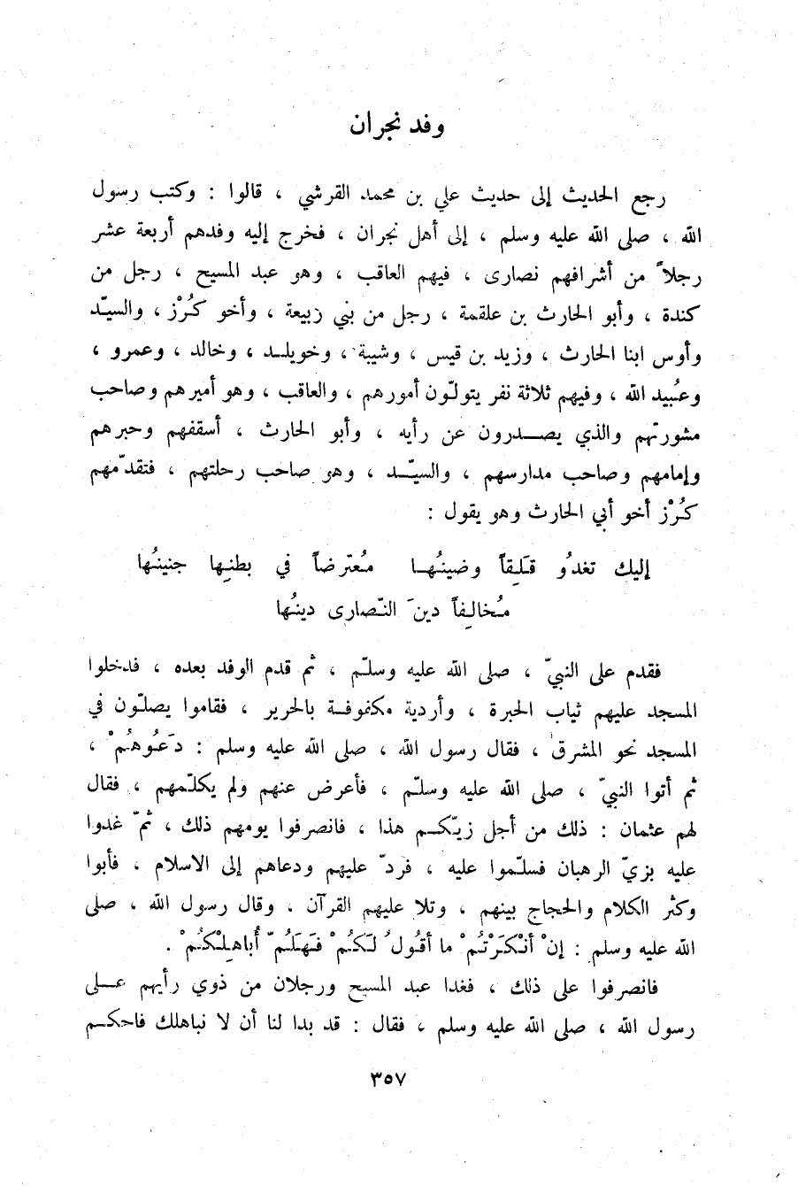 §وَفْدُ نَجْرَانَ رَجَعَ الْحَدِيثُ إِلَى حَدِيثِ عَلِيِّ بْنِ مُحَمَّدٍ الْقُرَشِيِّ قَالُوا: وَكَتَبَ رَسُولُ اللَّهِ صلّى الله عليه وسلم إِلَى أَهْلِ نَجْرَانَ فَخَرَجَ إِلَيْهِ وَفْدُهُمْ أَرْبَعَةَ عَشَرَ رَجُلًا مِنْ أَشْرَافِهِمْ نَصَارَى، فِيهِمُ الْعَاقِبُ وَهُوَ عَبْدُ الْمَسِيحِ رَجُلٌ مِنْ كِنْدَةَ وَأَبُو الْحَارِثِ بْنُ عَلْقَمَةَ رَجُلٌ مِنْ بَنِي رَبِيعَةَ وَأَخُو كُرْزٍ وَالسَّيِّدُ وَأَوْسُ ابْنَا الْحَارِثِ وَزَيْدُ بْنُ قَيْسٍ وَشَيْبَةُ وَخُوَيْلِدٌ وَخَالِدٌ وَعَمْرٌو وَعُبَيْدُ اللَّهِ وَفِيهِمْ ثَلَاثَةُ نَفَرٍ يَتَوَلُّونَ أُمُورَهُمْ وَالْعَاقِبُ وَهُوَ أَمِيرُهُمْ، وَصَاحِبُ مَشُورَتِهِمْ وَالَّذِي يَصْدُرُونَ عَنْ رَأْيِهِ وَأَبُو الْحَارِثِ أَسْقُفُهُمْ وَحَبْرُهُمْ وَإِمَامُهُمْ وَصَاحِبُ مَدَارِسِهِمْ وَالسَّيِّدُ وَهُوَ صَاحِبُ رِحْلَتِهِمْ، فَتَقَدَّمَهُمْ كُرْزٌ أَخُو أَبِي الْحَارِثِ وَهُوَ يَقُولُ: