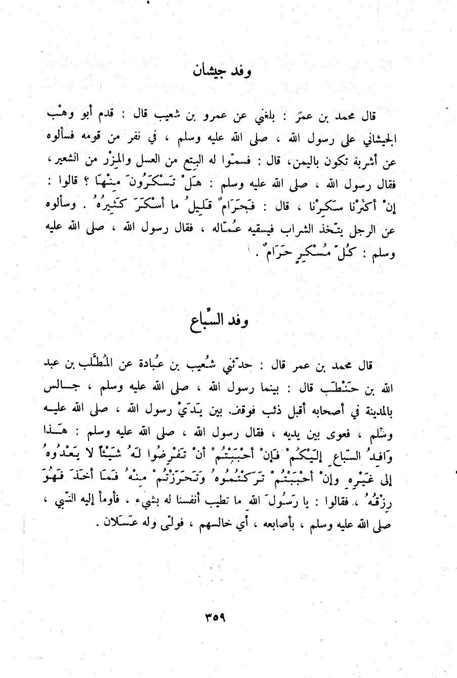قَالَ مُحَمَّدُ بْنُ عُمَرَ: بَلَغَنِي عَنْ عَمْرِو بْنِ شُعَيْبٍ قَالَ: قَدِمَ أَبُو وَهْبٍ الْجَيْشَانِيُّ عَلَى رَسُولِ اللَّهِ صلّى الله عليه وسلم فِي نَفَرٍ مِنْ قَوْمِهِ فَسَأَلُوهُ عَنْ أَشْرِبَةٍ تَكُونُ بِالْيَمَنِ قَالَ: فَسَمُّوا لَهُ الْبِتْعَ مِنَ الْعَسَلِ وَالْمِزْرَ مِنَ الشَّعِيرِ، فَقَالَ رَسُولُ اللَّهِ صلّى الله عليه وسلم: «§هَلْ تَسْكَرُونَ مِنْهَا؟» قَالُوا: إِنْ أَكْثَرْنَا سَكِرْنَا قَالَ: «فَحَرَامٌ قَلِيلُ مَا أَسْكَرَ كَثِيرُهُ» وَسَأَلُوهُ عَنِ الرَّجُلِ يَتَّخِذُ الشَّرَابَ فَيَسْقِيهِ عُمَّالَهُ، فَقَالَ رَسُولُ اللَّهِ صلّى الله عليه وسلم: «كُلُّ مُسْكِرٍ حَرَامٌ»