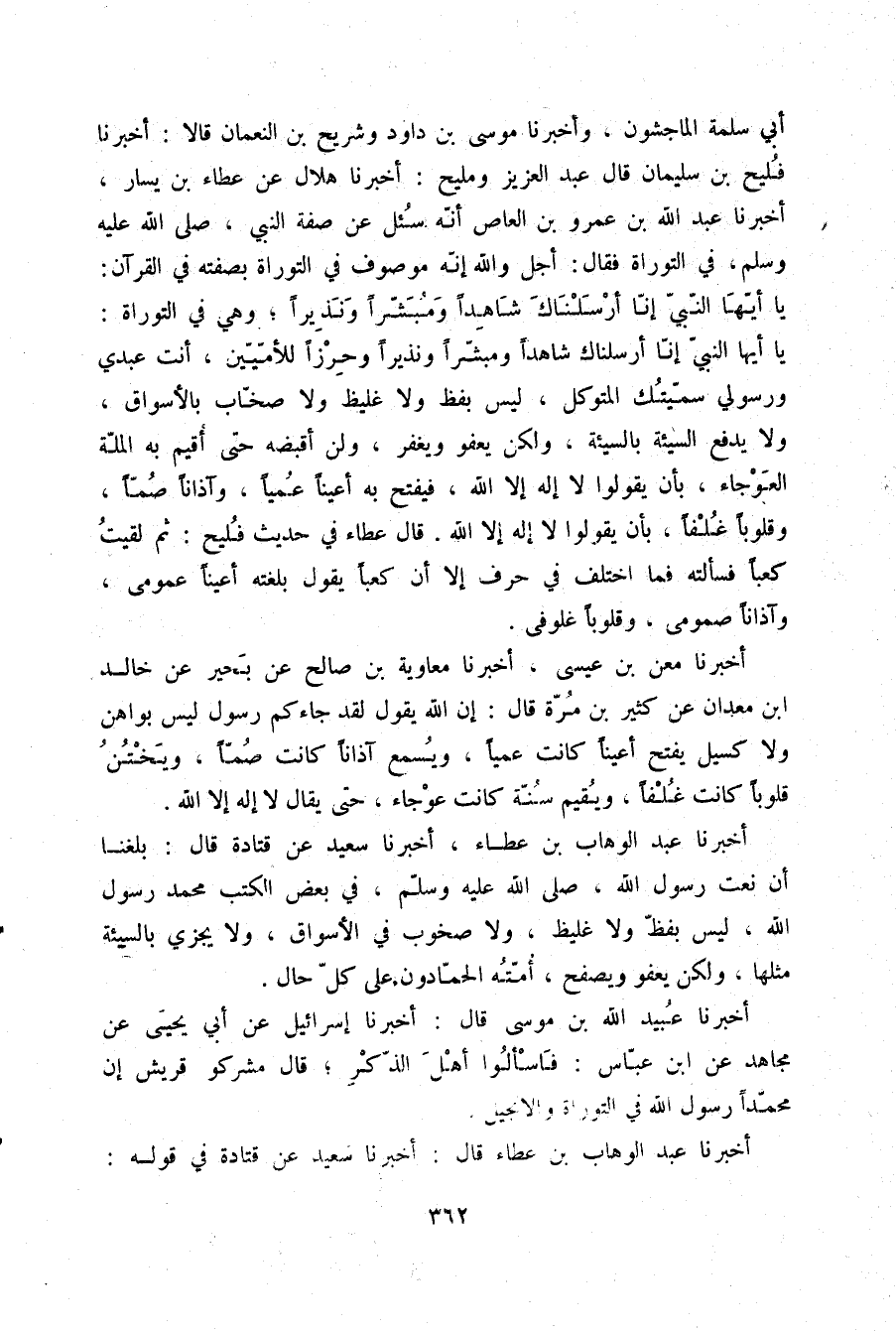 أَخْبَرَنَا عَبْدُ الْوَهَّابِ بْنُ عَطَاءٍ، أَخْبَرَنَا سَعِيدٌ، عَنْ قَتَادَةَ قَالَ: بَلَغَنَا أَنَّ نَعْتَ رَسُولِ اللَّهِ صلّى الله عليه وسلم فِي بَعْضِ الْكُتُبِ: §مُحَمَّدٌ رَسُولُ اللَّهِ لَيْسَ بِفَظٍّ وَلَا غَلِيظٍ وَلَا صَخُوبٍ فِي الْأَسْوَاقِ وَلَا يَجْزِي بِالسَّيِّئَةَ مِثْلَهَا، وَلَكِنْ يَعْفُو وَيَصْفَحُ، أُمَّتُهُ الْحَمَّادُونَ عَلَى كُلِّ حَالٍ