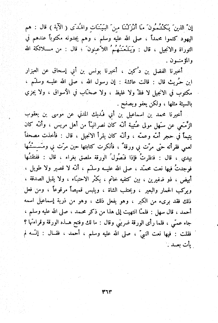 أَخْبَرَنَا مُحَمَّدُ بْنُ إِسْمَاعِيلَ بْنِ أَبِي فُدَيْكٍ الْمَدَنِيُّ، عَنْ مُوسَى بْنِ يَعْقُوبَ الزَّمْعِيِّ، عَنْ سَهْلٍ، مَوْلَى عُتَيْبَةَ أَنَّهُ كَانَ نَصْرَانِيًّا مِنْ أَهْلِ مَرِيسٍ وَأَنَّهُ كَانَ يَتِيمًا فِي حِجْرِ أُمِّهِ وَعَمِّهِ، وَأَنَّهُ كَانَ يَقْرَأُ الْإِنْجِيلَ قَالَ: فَأَخَذْتُ مُصْحَفًا لِعَمِّي فَقَرَأْتُهُ حَتَّى مَرَّتْ بِي وَرَقَةٌ فَأَنْكَرْتُ كِتَابَتَهَا حِينَ مَرَّتْ بِي وَمَسِسْتُهَا بِيَدِي، قَالَ: فَنَظَرْتُ فَإِذَا فَصُولُ الْوَرَقَةِ مُلْصَقٌ بِغِرَاءٍ، قَالَ: فَفَتَقْتُهَا فَوَجَدْتُ فِيهَا نَعْتَ مُحَمَّدٍ صلّى الله عليه وسلم: أَنَّهُ §لَا قَصِيرَ وَلَا طَوِيلَ، أَبْيَضُ، ذُو ضَفِيرَيْنِ بَيْنَ كَتِفَيْهِ خَاتَمٌ، يُكْثِرُ الِاحْتِبَاءَ، وَلَا يَقْبَلُ الصَّدَقَةَ، وَيَرْكَبُ الْحِمَارَ وَالْبَعِيرَ، وَيَحْتَلِبُ الشَّاةَ، وَيَلْبَسُ قَمِيصًا مَرْقُوعًا، وَمَنْ فَعَلَ ذَلِكَ فَقَدْ بَرِئَ مِنَ الْكِبْرِ وَهُوَ يَفْعَلُ ذَلِكَ وَهُوَ مِنْ ذُرِّيَّةِ إِسْمَاعِيلَ، اسْمُهُ أَحْمَدُ، قَالَ سَهْلٌ: فَلَمَّا انْتَهَيْتُ إِلَى هَذَا مِنْ ذِكْرِ مُحَمَّدٍ صلّى الله عليه وسلم جَاءَ عَمِّي، فَلَمَّا رَأَى الْوَرَقَةَ ضَرَبَنِي وَقَالَ: مَا لَكَ وَفَتْحِ هَذِهِ الْوَرَقَةِ وَقِرَاءَتِهَا، فَقُلْتُ: فِيهَا نَعْتُ النَّبِيِّ صلّى الله عليه وسلم أَحْمَدُ فَقَالَ: إِنَّهُ لَمْ يَأْتِ بَعْدُ