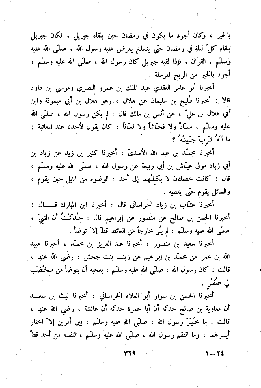 أَخْبَرَنَا أَبُو عَامِرٍ الْعَقَدِيُّ عَبْدُ الْمَلِكِ بْنُ عَمْرٍو الْبَصْرِيُّ وَمُوسَى بْنُ دَاوُدَ قَالَا: أَخْبَرَنَا فُلَيْحُ بْنُ سُلَيْمَانَ، عَنْ هِلَالٍ وَهُوَ هِلَالُ بْنُ أَبِي مَيْمُونَةَ وَابْنُ أَبِي هِلَالِ بْنُ عَلِيٍّ عَنْ أَنَسِ بْنِ مَالِكٍ قَالَ: §لَمْ يَكُنْ رَسُولُ اللَّهِ صلّى الله عليه وسلم سَبَّابًا وَلَا فَحَّاشًا وَلَا لَعَّانًا، كَانَ يَقُولُ لِأَحَدِنَا عِنْدَ الْمُعَاتَبَةِ: «مَا لَهُ تَرِبَ جَبِينُهُ؟»