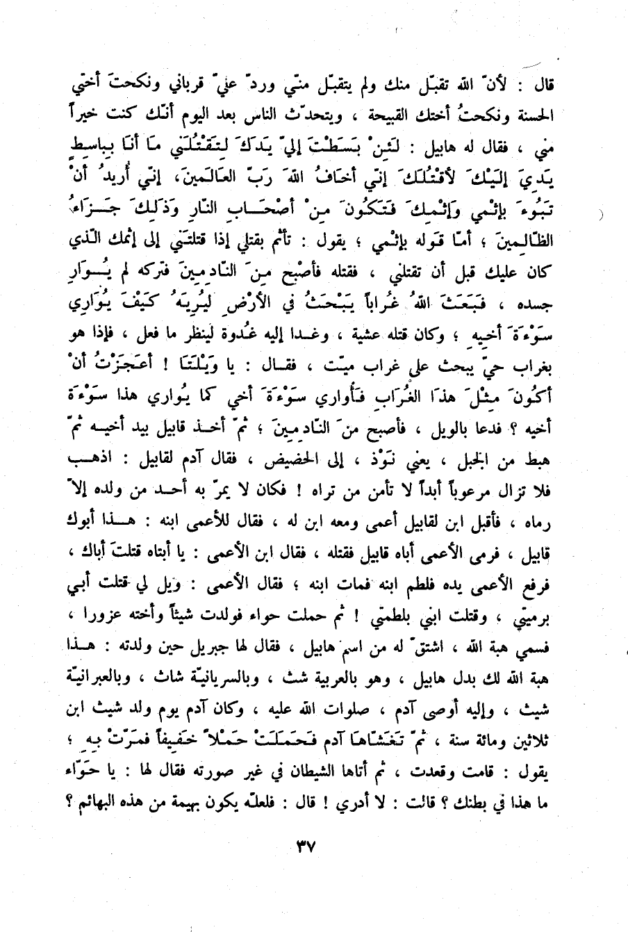 قَالَ: لِأَنَّ اللَّهَ تَقَبَّلَ مِنْكَ وَلَمْ يَتَقَبَّلْ مِنِّي وَرَدَّ عَلَيَّ قُرْبَانِي وَنَكَحْتَ أُخْتِي الْحَسَنَةَ وَنَكَحْتُ أُخْتَكَ الْقَبِيحَةَ وَيَتَحَدَّثُ النَّاسُ بَعْدَ الْيَوْمِ أَنَّكَ كُنْتَ خَيْرًا مِنِّي فَقَالَ لَهُ هَابِيلُ {لَئِنْ بَسَطْتَ إِلَيَّ يَدَكَ لِتَقْتُلَنِي مَا أَنَا بِبَاسِطٍ يَدِيَ إِلَيْكَ لِأَقْتُلَكَ إِنِّي أَخَافُ اللَّهَ رَبَّ الْعَالَمِينَ إِنِّي أُرِيدُ أَنْ تَبُوءَ بِإِثْمِي وَإِثْمِكَ فَتَكُونَ مِنْ أَصْحَابِ النَّارِ وَذَلِكَ جَزَاءُ الظَّالِمِينَ} [المائدة: 29] أَمَّا قَوْلُهُ: بِإِثْمِي يَقُولُ: تَأْثَمُ بِقَتْلِي إِذَا قَتَلْتَنِي إِلَى إِثْمِكَ الَّذِي كَانَ عَلَيْكَ قَبْلَ أَنْ تَقْتُلَنِي فَقَتَلَهُ فَأَصْبَحَ مِنَ النَّادِمِينَ فَتَرَكَهُ لَمْ يُوَارِ جَسَدَهُ {فَبَعَثَ اللَّهُ غُرَابًا يَبْحَثُ فِي الْأَرْضِ لِيُرِيَهُ كَيْفَ يُوَارِي سَوْءَةَ أَخِيهِ} [المائدة: 31] وَكَانَ قَتْلُهُ عَشِيَّةً، وَغَدَا إِلَيْهِ غُدْوَةً لَيَنْظُرَ مَا فَعَلَ فَإِذَا هُوَ بِغُرَابٍ حَيٍّ يَبْحَثُ عَلَى غُرَابٍ مَيِّتٍ فَقَالَ {يَا وَيْلَتَا أَعَجَزْتُ أَنْ أَكُونَ مِثْلَ هَذَا الْغُرَابِ فَأُوَارِيَ سَوْءَةَ أَخِي} [المائدة: 31] كَمَا يُوَارِي هَذَا سَوْءَةَ أَخِيهِ فَدَعَا بِالْوَيْلِ فَأَصْبَحَ مِنَ النَّادِمِينَ ثُمَّ أَخَذَ قَابِيلُ بِيَدِ أَخِيهِ ثُمَّ هَبَطَ مِنَ الْجَبَلِ يَعْنِي نَوْذَ إِلَى الْحَضِيضِ فَقَالَ آدَمُ لِقَابِيلَ: اذْهَبْ فَلَا تَزَالُ مَرْعُوبًا أَبَدًا لَا تَأْمَنُ مَنْ تَرَاهُ فَكَانَ لَا يَمُرُّ بِهِ أَحَدٌ مِنْ وَلَدِهِ إِلَّا رَمَاهُ فَأَقْبَلَ ابْنٌ لِقَابِيلَ أَعْمَى وَمَعَهُ ابْنٌ لَهُ فَقَالَ لِلْأَعْمَى ابْنِهِ: هَذَا أَبُوكَ قَابِيلُ فَرَمَى الْأَعْمَى أَبَاهُ قَابِيلَ فَقَتَلَهُ فَقَالَ ابْنُ الْأَعْمَى يَا أَبَتَاهُ قَتَلْتَ أَبَاكَ فَرَفَعَ الْأَعْمَى يَدَهُ فَلَطَمَ ابْنَهُ فَمَاتَ ابْنُهُ فَقَالَ الْأَعْمَى: وَيْلٌ لِي قَتَلْتُ أَبِي بِرَمْيَتِي وَقَتَلْتُ ابْنِي بِلَطْمَتِي ثُمَّ حَمَلَتْ حَوَّاءُ فَوَلَدَتْ شِيثًا وَأُخْتَهُ عَزْوَرَا فَسُمِّيَ هِبَةُ اللَّهِ اشْتُقَّ لَهُ مِنِ اسْمِ هَابِيلَ فَقَالَ لَهَا جِبْرِيلُ حِينَ وَلَدَتْهُ: هَذَا هِبَةُ اللَّهِ لَكِ بَدَلَ هَابِيلَ وَهُوَ بِالْعَرَبِيَّةِ شَثٌّ وَبِالسُّرْيَانِيَّةِ شَاثُ وَبِالْعِبْرَانِيَّةِ شِيثٌ وَإِلَيْهِ أَوْصَى آدَمُ صَلَوَاتُ اللَّهِ عَلَيْهِ وَكَانَ آدَمُ يَوْمَ وُلِدَ شِيثٌ ابْنُ ثَلَاثِينَ وَمِائَةِ سَنَةٍ ثُمَّ تَغَشَّاهَا آدَمُ فَحَمَلَتْ حَمْلًا خَفِيفًا فَمَرَّتْ بِهِ يَقُولُ قَامَتْ وَقَعَدَتْ ثُمَّ أَتَاهَا الشَّيْطَانُ فِي غَيْرِ صُورَتِهِ فَقَالَ لَهَا: يَا حَوَّاءُ مَا هَذَا فِي بَطْنِكِ؟ قَالَتْ: لَا أَدْرِي قَالَ: فَلَعَلَّهُ يَكُونُ بَهِيمَةً مِنْ هَذِهِ الْبَهَائِمِ