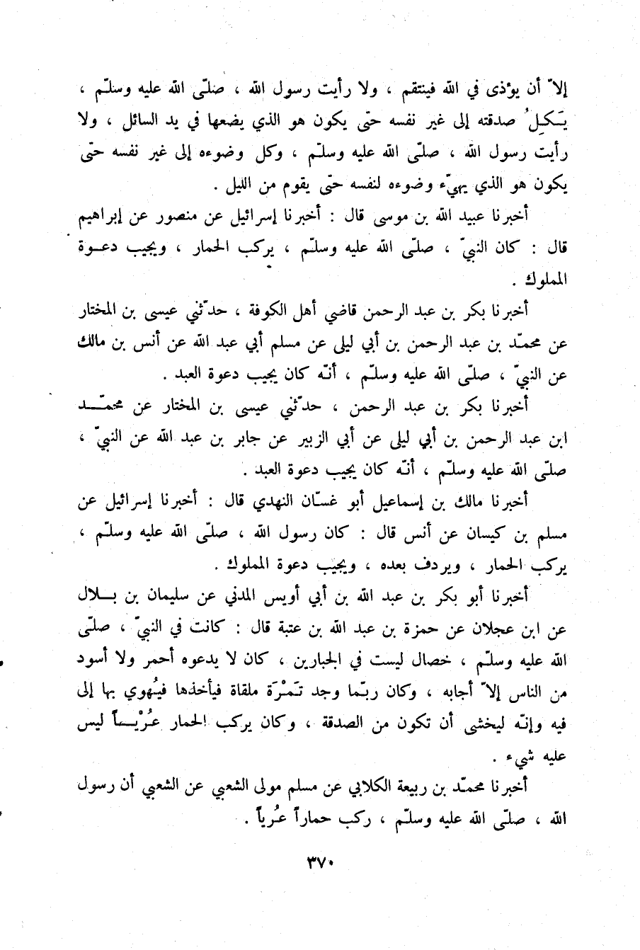 أَخْبَرَنَا عُبَيْدُ اللَّهِ بْنُ مُوسَى قَالَ: أَخْبَرَنَا إِسْرَائِيلُ، عَنْ مَنْصُورٍ، عَنْ إِبْرَاهِيمَ قَالَ: كَانَ النَّبِيُّ صلّى الله عليه وسلم §يَرْكَبُ الْحِمَارَ وَيُجِيبُ دَعْوَةَ الْمَمْلُوكِ