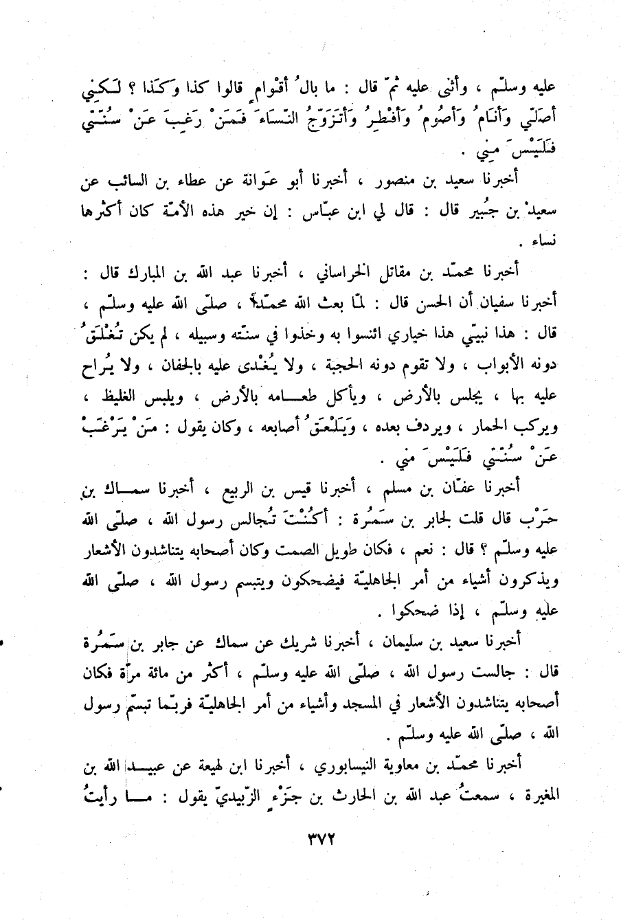 أَخْبَرَنَا سَعِيدُ بْنُ سُلَيْمَانَ، أَخْبَرَنَا شَرِيكٌ، عَنْ سِمَاكٍ، عَنْ جَابِرِ بْنِ سَمُرَةَ قَالَ: §جَالَسْتُ رَسُولَ اللَّهِ صلّى الله عليه وسلم أَكْثَرَ مِنْ مِائَةِ مَرَّةٍ فَكَانَ أَصْحَابُهُ يَتَنَاشَدُونَ الْأَشْعَارَ فِي الْمَسْجِدِ وَأَشْيَاءَ مِنْ أَمْرِ الْجَاهِلِيَّةِ، فَرُبَّمَا تَبَسَّمَ رَسُولُ اللَّهِ صلّى الله عليه وسلم