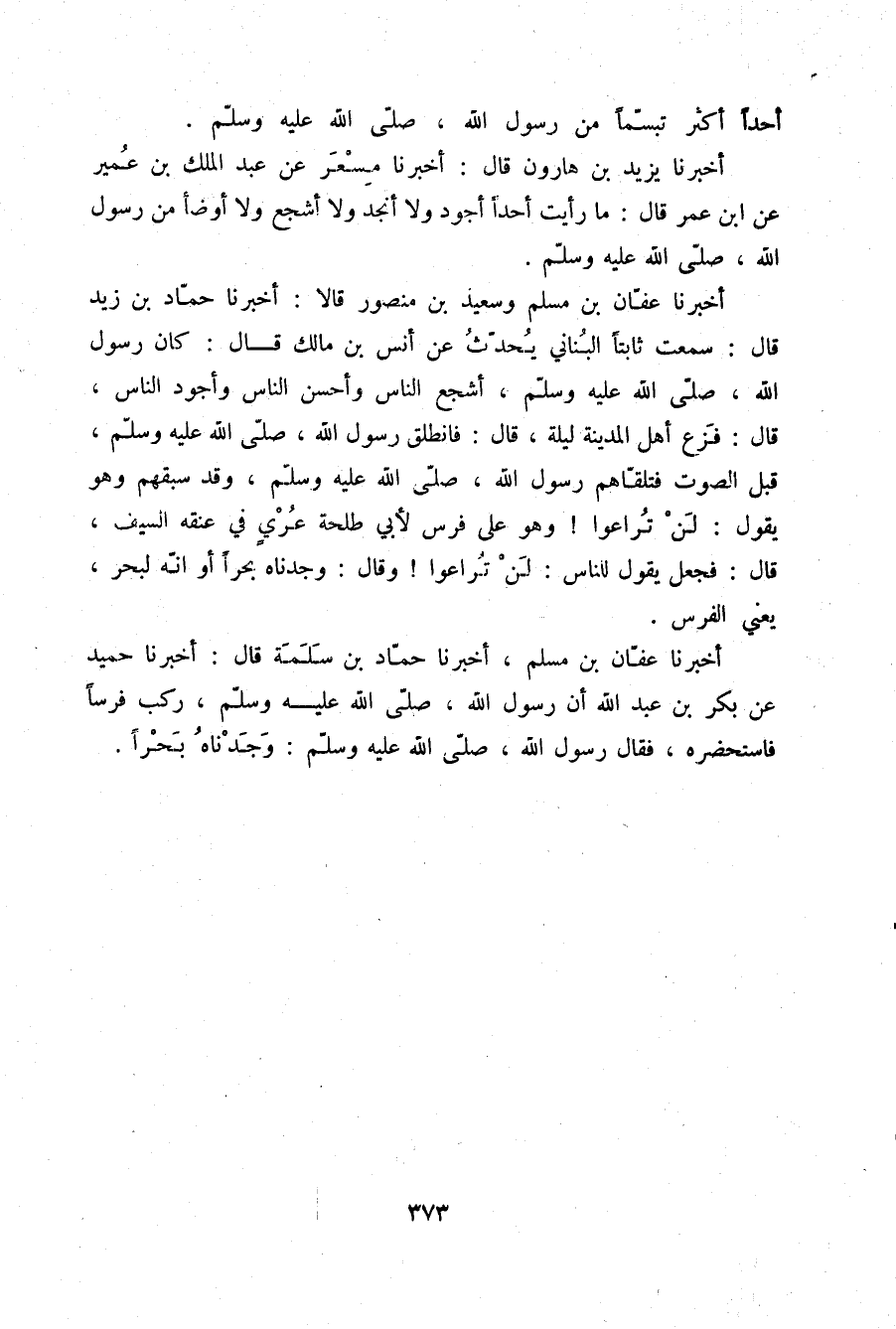 أَخْبَرَنَا عَفَّانُ بْنُ مُسْلِمٍ، وَسَعِيدُ بْنُ مَنْصُورٍ قَالَا: أَخْبَرَنَا حَمَّادُ بْنُ زَيْدٍ قَالَ: سَمِعْتُ ثَابِتًا الْبُنَانِيَّ يُحَدِّثُ عَنْ أَنَسِ بْنِ مَالِكٍ قَالَ: كَانَ رَسُولُ اللَّهِ صلّى الله عليه وسلم §أَشْجَعَ النَّاسِ وَأَحْسَنَ النَّاسِ وَأَجْوَدَ النَّاسِ، قَالَ: فَزِعَ أَهْلُ الْمَدِينَةِ لَيْلَةً فَانْطَلَقَ رَسُولُ اللَّهِ صلّى الله عليه وسلم قِبَلَ الصَّوْتِ، فَتَلَقَّاهُمْ رَسُولُ اللَّهِ صلّى الله عليه وسلم وَقَدْ سَبَقَهُمْ وَهُوَ يَقُولُ: «لَنْ تُرَاعُوا» وَهُوَ عَلَى فَرَسٍ لِأَبِي طَلْحَةَ عُرْيٍ فِي عُنُقِهِ السَّيْفُ، قَالَ: فَجَعَلَ يَقُولُ لِلنَّاسِ: «لَنْ تُرَاعُوا» وَقَالَ: وَجَدْنَاهُ بَحْرًا أَوْ إِنَّهُ لَبَحْرٌ يَعْنِي الْفَرَسَ
