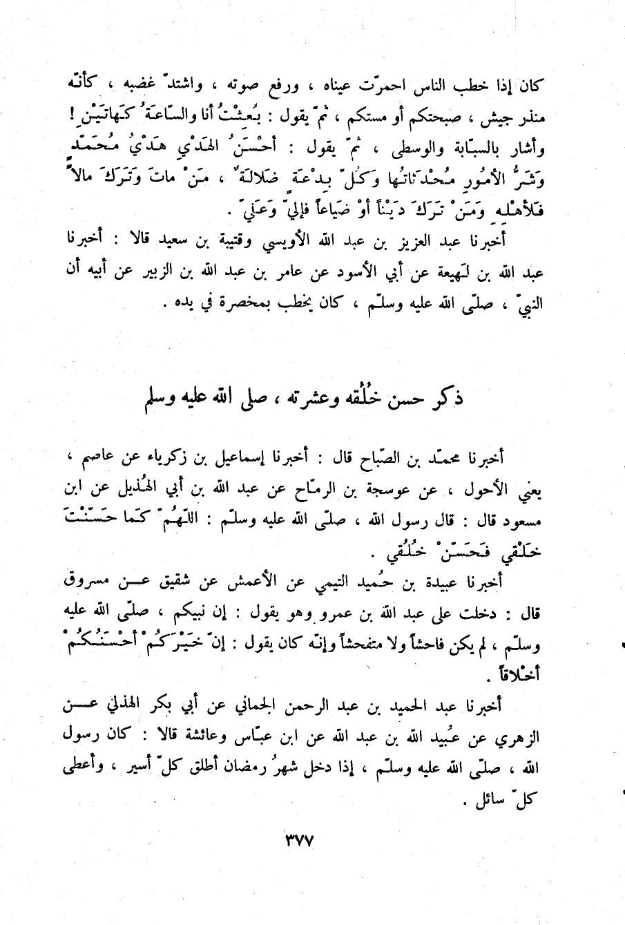 أَخْبَرَنَا عَبِيدَةُ بْنُ حُمَيْدٍ التَّيْمِيُّ، عَنِ الْأَعْمَشِ، عَنْ شَقِيقٍ، عَنْ مَسْرُوقٍ قَالَ: دَخَلْتُ عَلَى عَبْدِ اللَّهِ بْنِ عَمْرٍو وَهُوَ يَقُولُ: إِنَّ نَبِيَّكُمْ صلّى الله عليه وسلم لَمْ يَكُنْ فَاحِشًا وَلَا مُتَفَحِّشًا، وَإِنَّهُ كَانَ يَقُولُ: «إِنَّ §خَيْرَكُمْ أَحْسَنُكُمْ أَخْلَاقًا»
