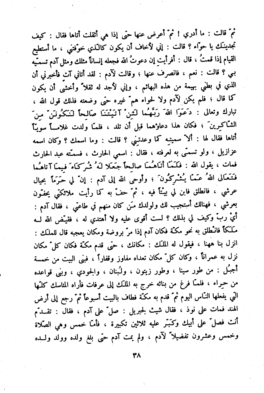 ثُمَّ قَالَتْ: مَا أَدْرِي ثُمَّ أَعْرَضَ عَنْهَا حَتَّى إِذَا هِيَ أَثْقَلَتْ أَتَاهَا، فَقَالَ: كَيْفَ تَجِدِينَكِ يَا حَوَّاءُ؟ قَالَتْ: إِنِّي لَأَخَافُ أَنْ يَكُونَ كَالَّذِي خَوَّفْتَنِي مَا أَسْتَطِيعُ الْقِيَامَ إِذَا قُمْتُ قَالَ: أَفَرَأَيْتِ إِنْ دَعَوْتُ اللَّهَ فَجَعَلَهُ إِنْسَانًا مِثْلَكَ وَمِثْلَ آدَمَ تُسَمِّيهِ بِي؟ قَالَتْ: نَعَمْ فَانْصَرَفَ عَنْهَا وَقَالَتْ لِآدَمَ لَقَدْ أَتَانِي آتٍ فَأَخْبَرَنِي أَنَّ الَّذِي فِي بَطْنِي بَهِيمَةً مِنْ هَذِهِ الْبَهَائِمِ وَإِنِّي لَأَجِدُ لَهُ ثُقْلًا وَأَخْشَى أَنْ يَكُونَ كَمَا قَالَ فَلَمْ يَكُنْ لِآدَمَ وَلَا لِحَوَّاءَ هَمٌّ غَيْرَهُ حَتَّى وَضَعَتْهُ فَذَلِكَ قَوْلُ اللَّهِ تَبَارَكَ وَتَعَالَى {دَعَوْا اللَّهَ رَبَّهُمَا لَئِنْ آتَيْتَنَا صَالِحًا لَنَكُونَنَّ مِنَ الشَّاكِرِينَ} [الأعراف: 189] فَكَانَ هَذَا دُعَاؤُهُمَا قَبْلَ أَنْ تَلِدَ فَلَمَّا وَلَدَتْ غُلَامًا سَوِيًّا أَتَاهَا فَقَالَ لَهَا: أَلَا سَمَّيْتِهِ كَمَا وَعَدْتِنِي؟ قَالَتْ: وَمَا اسْمُكَ؟ وَكَانَ اسْمُهُ عَزَازِيلُ وَلَوْ تَسَمَّى بِهِ لَعَرَفَتْهُ فَقَالَ: اسْمِي الْحَارِثُ فَسَمَّتْهُ: عَبْدُ الْحَارِثِ فَمَاتَ يَقُولُ اللَّهُ {فَلَمَّا آتَاهُمَا صَالِحًا جَعَلَا لَهُ شُرَكَاءَ فِيمَا آتَاهُمَا فَتَعَالَى اللَّهُ عَمَّا يُشْرِكُونَ} [الأعراف: 190] وَأَوْحَى اللَّهُ إِلَى آدَمَ إِنَّ لِي حَرَمًا بِحِيَالِ عَرْشِي فَانْطَلِقْ فَابْنِ لِي بَيْتًا فِيهِ ثُمَّ حُفَّ بِهِ كَمَا رَأَيْتَ مَلَائِكَتِي يَحُفُّونَ بِعَرْشِي فَهُنَالِكَ أَسْتَجِيبُ لَكَ وَلِوَلَدِكَ مَنْ كَانَ مِنْهُمْ فِي طَاعَتِي فَقَالَ آدَمُ: أَيْ رَبِّ وَكَيْفَ لِي بِذَلِكَ لَسْتُ أَقْوَى عَلَيْهِ وَلَا أَهْتَدِي لَهُ فَقَيَّضَ اللَّهُ لَهُ مَلَكًا فَانْطَلَقَ بِهِ نَحْوَ مَكَّةَ فَكَانَ آدَمُ إِذَا مَرَّ بِرَوْضَةٍ وَمَكَانٍ يُعْجِبُهُ قَالَ لِلْمَلَكِ: انْزِلْ بِنَا هَهُنَا فَيَقُولُ لَهُ الْمَلَكُ: مَكَانَكَ حَتَّى قَدِمَ مَكَّةَ فَكَانَ كُلُّ مَكَانٍ نَزَلَ بِهِ عُمْرَانًا وَكَانَ كُلُّ مَكَانٍ تَعَدَّاهُ مَفَاوِزَ وَقِفَارًا فَبَنَى الْبَيْتَ مِنْ خَمْسَةِ أَجْبُلٍ: مِنْ طُورِ سِينَا، وَطُورِ زَيْتُونٍ وَلُبْنَانَ وَالْجُودِيِّ وَبَنَى قَوَاعِدَهُ مِنْ حِرَاءٍ فَلَمَّا فَرَغَ مِنْ بِنَائِهِ خَرَجَ بِهِ الْمَلَكُ إِلَى عَرَفَاتٍ فَأَرَاهُ الْمَنَاسِكَ كُلَّهَا الَّتِي يَفْعَلُهَا النَّاسُ الْيَوْمَ ثُمَّ قَدِمَ بِهِ مَكَّةَ فَطَافَ بِالْبَيْتِ أُسْبُوعًا ثُمَّ رَجَعَ إِلَى أَرْضِ الْهِنْدِ فَمَاتَ عَلَى نَوْذَ فَقَالَ شِيثٌ لِجِبْرِيلَ: صَلِّ عَلَى آدَمَ فَقَالَ: تَقَدَّمْ أَنْتَ فَصَلِّ عَلَى أَبِيكَ وَكَبِّرْ عَلَيْهِ ثَلَاثِينَ تَكْبِيرَةً فَأَمَّا خَمْسٌ وَهِيَ الصَّلَاةُ وَخَمْسٌ وَعِشْرُونَ تَفْضِيلًا لِآدَمَ وَلَمْ يَمُتْ آدَمُ حَتَّى بَلَغَ وَلَدُهُ وَوَلَدُ وَلَدِهِ