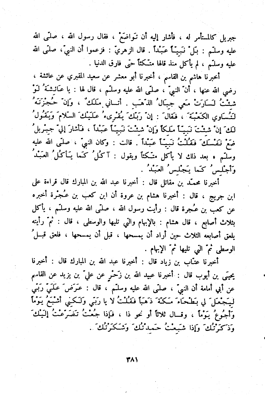 أَخْبَرَنَا عَتَّابُ بْنُ زِيَادٍ قَالَ: أَخْبَرَنَا عَبْدُ اللَّهِ بْنُ الْمُبَارَكِ قَالَ: أَخْبَرَنَا يَحْيَى بْنُ أَيُّوبَ قَالَ: أَخْبَرَنَا عُبَيْدُ اللَّهِ بْنُ زَحْرٍ، عَنْ عَلِيِّ بْنِ يَزِيدَ، عَنِ الْقَاسِمِ، عَنْ أَبِي أُمَامَةَ، أَنَّ النَّبِيَّ صلّى الله عليه وسلم قَالَ: " §عَرَضَ عَلَيَّ رَبِّي لِيَجْعَلَ لِي بَطْحَاءَ مَكَّةَ ذَهَبًا فَقُلْتُ: «لَا يَا رَبِّي، وَلَكِنِّي أَشْبَعُ يَوْمًا وَأَجُوعُ يَوْمًا» وَقَالَ: ثَلَاثًا أَوْ نَحْوَ ذَا: «فَإِذَا جُعْتُ تَضَرَّعْتُ إِلَيْكَ وَذَكَرْتُكَ، وَإِذَا شَبِعْتُ حَمِدْتُكَ وَشَكَرْتُكَ»