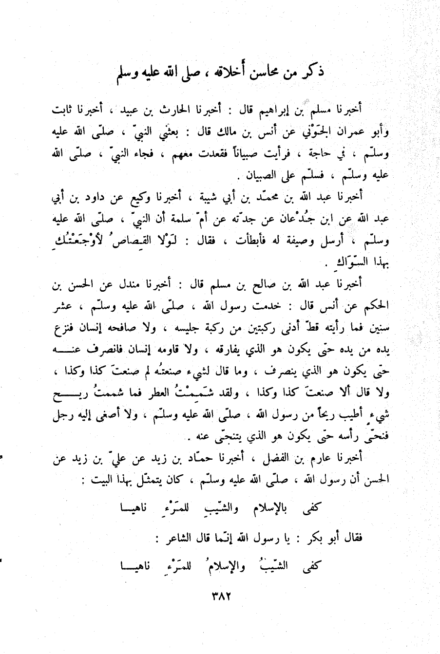أَخْبَرَنَا عَارِمُ بْنُ الْفَضْلِ، أَخْبَرَنَا حَمَّادُ بْنُ زَيْدٍ، عَنْ عَلِيِّ بْنِ زَيْدٍ، عَنِ الْحَسَنِ " أَنَّ رَسُولَ اللَّهِ صلّى الله عليه وسلم كَانَ §يَتَمَثَّلُ بِهَذَا الْبَيْتِ: كَفَى بِالْإِسْلَامِ وَالشَّيْبِ لِلْمَرْءِ نَاهِيًا فَقَالَ أَبُو بَكْرٍ: يَا رَسُولَ اللَّهِ، إِنَّمَا قَالَ الشَّاعِرُ: