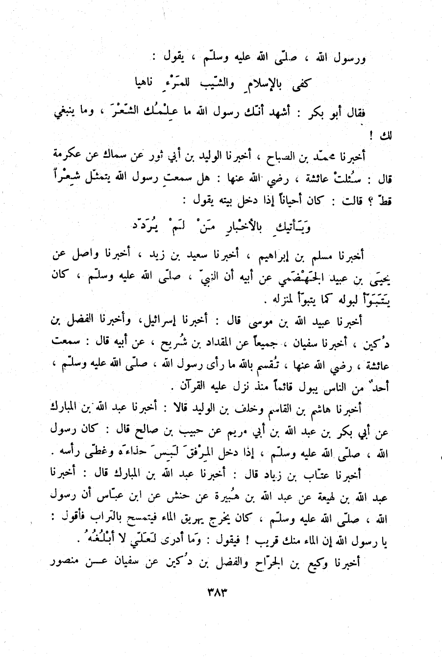 أَخْبَرَنَا مُحَمَّدُ بْنُ الصَّبَّاحِ، أَخْبَرَنَا الْوَلِيدُ بْنُ أَبِي ثَوْرٍ، عَنْ سِمَاكٍ، عَنْ عِكْرِمَةَ قَالَ: سُئِلَتْ عَائِشَةُ رَضِيَ اللَّهُ عَنْهَا: هَلْ سَمِعْتِ رَسُولَ اللَّهِ يَتَمَثَّلُ شِعْرًا قَطُّ؟ قَالَتْ: كَانَ §أَحْيَانًا إِذَا دَخَلَ بَيْتَهُ يَقُولُ: «