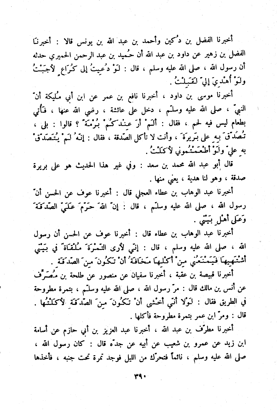 أَخْبَرَنَا مُوسَى بْنُ دَاوُدَ، أَخْبَرَنَا نَافِعُ بْنُ عُمَرَ، عَنِ ابْنِ أَبِي مُلَيْكَةَ، أَنَّ النَّبِيَّ صلّى الله عليه وسلم دَخَلَ عَلَى عَائِشَةَ رَضِيَ اللَّهُ عَنْهَا فَأُتِيَ بِطَعَامٍ لَيْسَ فِيهِ لَحْمٌ، فَقَالَ: «§أَلَمْ أَرَ عِنْدَكُمْ بُرْمَةً؟» قَالُوا: بَلَى تُصُدِّقَ بِهِ عَلَى بَرِيرَةَ وَأَنْتَ لَا تَأْكُلُ الصَّدَقَةَ، فَقَالَ: «إِنَّهُ لَمْ يُتَصَدَّقْ بِهِ عَلَيَّ وَلَوْ أَطْعَمْتُمُونِي لَأَكَلْتُ» قَالَ أَبُو عَبْدِ اللَّهِ مُحَمَّدُ بْنُ سَعْدٍ وَفِي غَيْرِ هَذَا الْحَدِيثِ هُوَ عَلَى بَرِيرَةَ صَدَقَةٌ، وَهُوَ لَنَا هَدِيَّةٌ يَعْنِي مِنْهَا