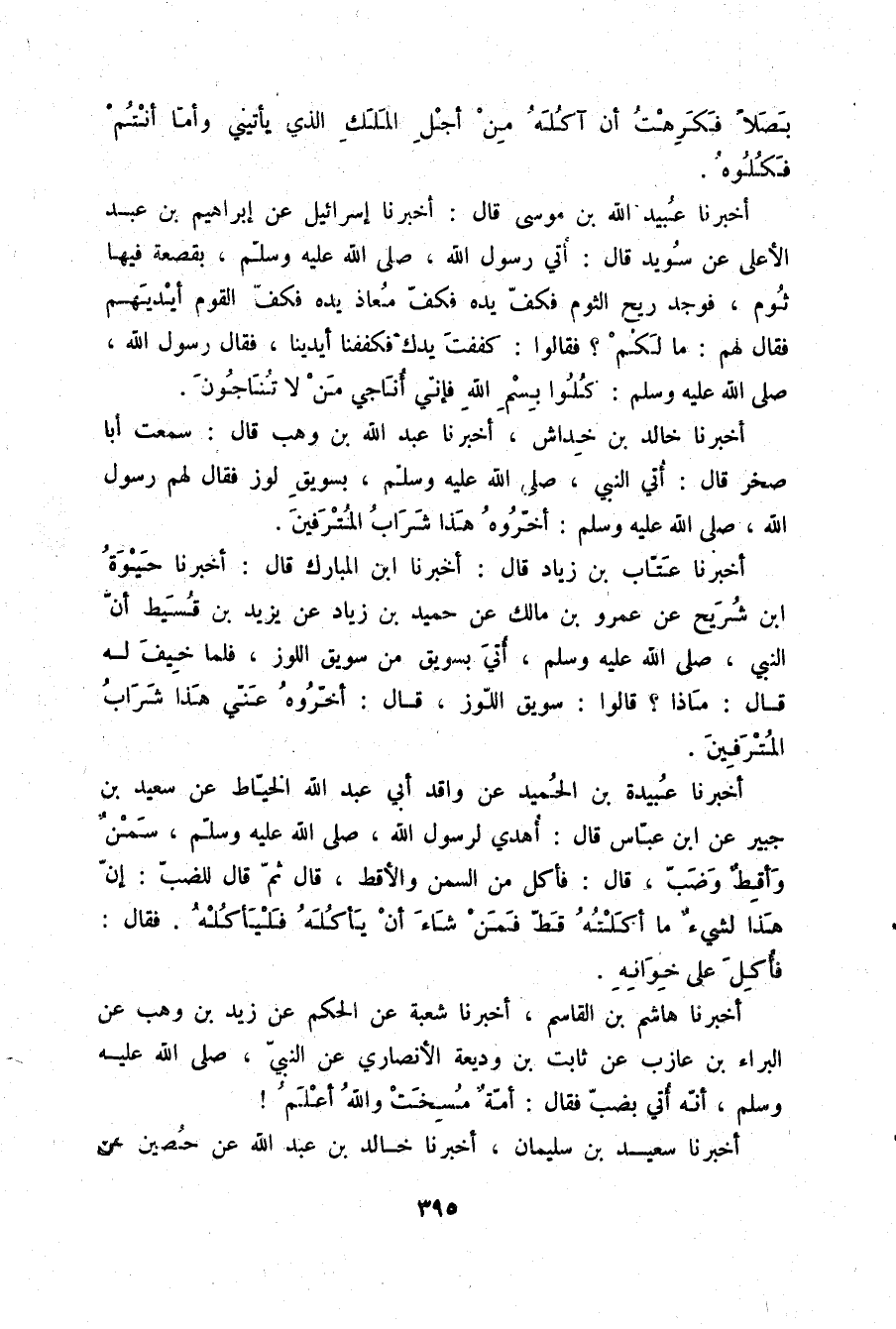 أَخْبَرَنَا عَبِيدَةُ بْنُ الْحَمِيدِ، عَنْ وَاقِدٍ أَبِي عَبْدِ اللَّهِ الْخَيَّاطِ، عَنْ سَعِيدِ بْنِ جُبَيْرٍ، عَنِ ابْنِ عَبَّاسٍ قَالَ: «أُهْدِيَ لِرَسُولِ اللَّهِ صلّى الله عليه وسلم سَمْنٌ وَأَقْطٌ وَضَبٌّ» قَالَ: فَأَكَلَ مِنَ السَّمْنِ وَالْأَقْطِ قَالَ: ثُمَّ قَالَ لِلضَّبِّ: «إِنَّ §هَذَا لَشَيْءٌ مَا أَكَلْتُهُ قَطُّ فَمَنْ شَاءَ فَلْيَأْكُلْهُ» ، فَقَالَ: فَأُكِلَ عَلَى خِوَانِهِ "