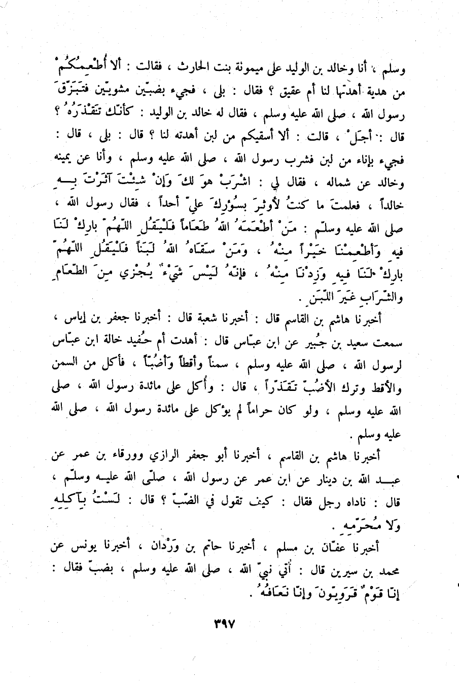 أَخْبَرَنَا هَاشِمُ بْنُ الْقَاسِمِ قَالَ: أَخْبَرَنَا شُعْبَةُ قَالَ: أَخْبَرَنَا جَعْفَرُ بْنُ إِيَاسَ، سَمِعْتُ سَعِيدَ بْنَ جُبَيْرٍ، عَنِ ابْنِ عَبَّاسٍ قَالَ: أَهْدَتْ أُمُّ حُفَيْدٍ خَالَةُ ابْنِ عَبَّاسٍ لِرَسُولِ اللَّهِ صلّى الله عليه وسلم سَمْنًا وَأَقِطًا وَأَضُبًّا §فَأَكَلَ مِنَ السَّمْنِ وَالْأَقِطِ وَتَرَكَ الْأَضُبَّ تَقَذُّرًا، قَالَ: وَأُكِلَ عَلَى مَائِدَةِ رَسُولِ اللَّهِ صلّى الله عليه وسلم وَلَوْ كَانَ حَرَامًا لَمْ يُؤْكَلْ عَلَى مَائِدَةِ رَسُولِ اللَّهِ صلّى الله عليه وسلم
