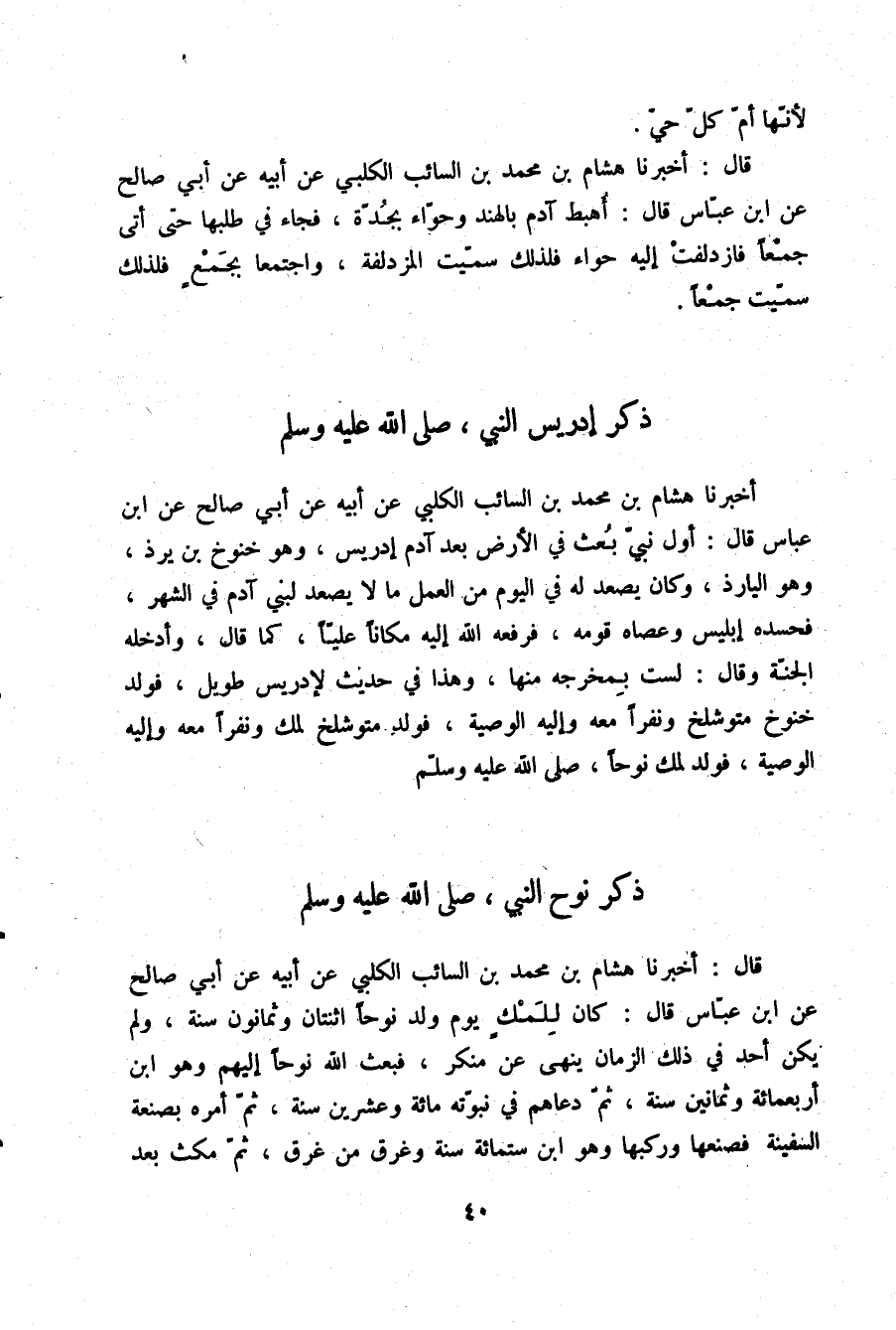 أَخْبَرَنَا هِشَامُ بْنُ مُحَمَّدِ بْنِ السَّائِبِ الْكَلْبِيُّ، عَنْ أَبِيهِ، عَنْ أَبِي صَالِحٍ، عَنِ ابْنِ عَبَّاسٍ قَالَ: " §أَوَّلُ نَبِيٍّ بُعِثَ فِي الْأَرْضِ بَعْدَ آدَمَ إِدْرِيسُ وَهُوَ خَنُوخُ بْنُ يَرْذَ وَهُوَ الْيَارِذُ وَكَانَ يَصْعَدُ لَهُ فِي الْيَوْمِ مِنَ الْعَمَلِ مَا لَا يَصْعَدُ لِبَنِي آدَمَ فِي الشَّهْرِ فَحَسَدَهُ إِبْلِيسُ وَعَصَاهُ قَوْمُهُ فَرَفَعَهُ اللَّهُ إِلَيْهِ مَكَانًا عَلِيًّا كَمَا قَالَ وَأَدْخَلَهُ الْجَنَّةَ وَقَالَ: لَسْتُ بِمُخْرِجِهِ مِنْهَا، وَهَذَا فِي حَدِيثٍ لِإِدْرِيسَ طَوِيلٍ فَوَلَدَ خَنُوخُ مُتَوَشْلِخَ وَنَفَرًا مَعَهُ وَإِلَيْهِ الْوَصِيَّةُ فَوَلَدَ مُتَوَشْلِخُ لَمْكَ وَنَفَرًا مَعَهُ وَإِلَيْهُ الْوَصِيَّةُ فَوَلَدَ لَمْكٌ نُوحًا صلّى الله عليه وسلم "