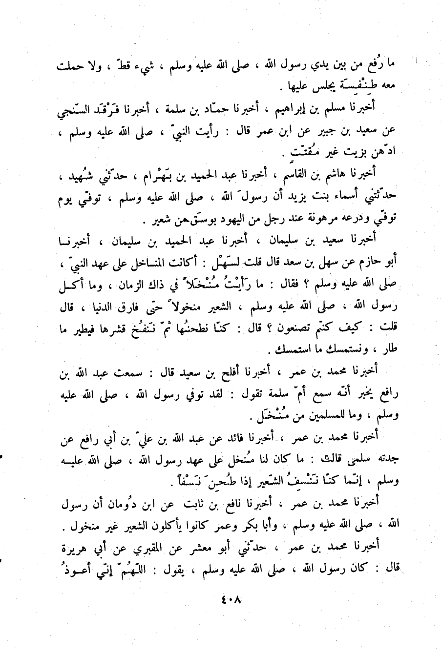 أَخْبَرَنَا هَاشِمُ بْنُ الْقَاسِمِ، أَخْبَرَنَا عَبْدُ الْحَمِيدِ بْنُ بَهْرَامَ، حَدَّثَنِي شَهِيدٌ، حَدَّثَتْنِي أَسْمَاءُ بِنْتُ يَزِيدَ، " أَنَّ رَسُولَ اللَّهِ صلّى الله عليه وسلم §تُوُفِّيَ يَوْمَ تُوُفِّيَ وَدِرْعُهُ مَرْهُونَةٌ عِنْدَ رَجُلٍ مِنَ الْيَهُودِ بِوَسْقٍ مِنْ شَعِيرٍ
