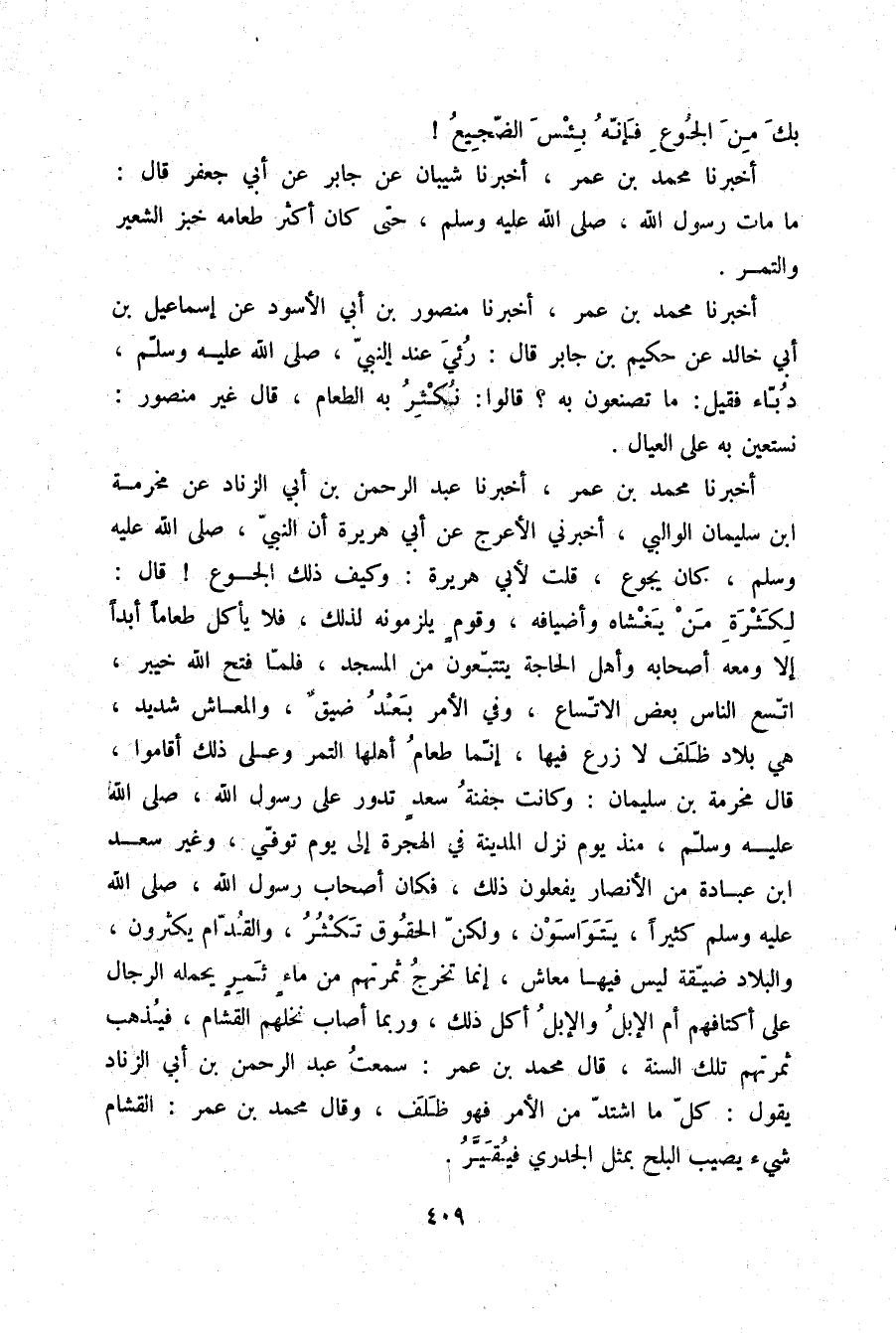أَخْبَرَنَا مُحَمَّدُ بْنُ عُمَرَ، أَخْبَرَنَا عَبْدُ الرَّحْمَنِ بْنُ أَبِي الزِّنَادِ، عَنْ مَخْرَمَةَ بْنِ سُلَيْمَانَ الْوَالِبِيِّ، أَخْبَرَنِي الْأَعْرَجُ، عَنْ أَبِي هُرَيْرَةَ، " أَنَّ النَّبِيَّ صلّى الله عليه وسلم كَانَ يَجُوعُ قُلْتُ لِأَبِي هُرَيْرَةَ: وَكَيْفَ ذَلِكَ الْجُوعُ؟ قَالَ: §لِكَثْرَةِ مَنْ يَغْشَاهُ وَأَضْيَافُهُ وَقَوْمٌ يَلْزَمُونَهُ لِذَلِكَ فَلَا يَأْكُلُ طَعَامًا أَبَدًا إِلَّا وَمَعَهُ أَصْحَابُهُ وَأَهْلُ الْحَاجَةِ يَتَتَبَّعُونَ مِنَ الْمَسْجِدِ فَلَمَّا فَتْحَ اللَّهُ خَيْبَرَ اتَّسَعَ النَّاسُ بَعْضَ الِاتِّسَاعِ وَفِي الْأَمْرِ بَعْدُ ضِيقٌ وَالْمَعَاشُ شَدِيدٌ هِيَ بِلَادُ ظَلَفٍ لَا زَرْعَ فِيهَا إِنَّمَا طَعَامُ أَهْلِهَا التَّمْرُ وَعَلَى ذَلِكَ أَقَامُوا قَالَ مَخْرَمَةُ بْنُ سُلَيْمَانَ: وَكَانَتْ جَفْنَةُ سَعْدٍ تَدُورُ عَلَى رَسُولِ اللَّهِ صلّى الله عليه وسلم مُنْذُ يَوْمَ نَزَلَ الْمَدِينَةَ فِي الْهِجْرَةِ إِلَى يَوْمِ تُوُفِّيَ وَغَيْرُ سَعْدِ بْنِ عُبَادَةَ مِنَ الْأَنْصَارِ يَفْعَلُونَ ذَلِكَ فَكَانَ أَصْحَابُ رَسُولِ اللَّهِ صلّى الله عليه وسلم كَثِيرًا يَتَوَاسُونَ وَلَكِنَّ الْحُقُوقَ تَكْثُرُ وَالْقُدَّامُ يَكْثُرُونَ وَالْبِلَادُ ضَيِّقَةٌ لَيْسَ فِيهَا مَعَاشٌ إِنَّمَا تَخْرُجُ ثَمَرَتُهُمْ مِنْ مَاءٍ ثَمِرٍ يَحْمِلُهُ الرِّجَالُ عَلَى أَكْتَافِهِمْ أَمِ الْإِبِلُ، وَالْإِبِلُ أَكَلَ ذَلِكَ وَرُبَّمَا أَصَابَ نَخْلَهُمُ الْقُشَامُ فَيُذْهِبُ ثَمَرَتَهُمْ تِلْكَ السَّنَةِ