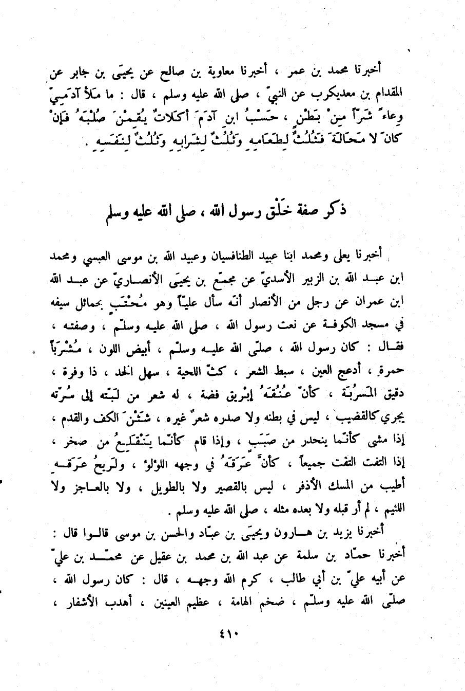 أَخْبَرَنَا يَزِيدُ بْنُ هَارُونَ، وَيَحْيَى بْنُ عَبَّادٍ، وَالْحَسَنُ بْنُ مُوسَى، قَالُوا: قَالَ: أَخْبَرَنَا حَمَّادُ بْنُ سَلَمَةَ، عَنْ عَبْدِ اللَّهِ بْنِ مُحَمَّدِ بْنِ عَقِيلٍ، عَنْ مُحَمَّدِ بْنِ عَلِيٍّ، عَنْ أَبِيهِ عَلِيِّ بْنِ أَبِي طَالِبٍ كَرَّمَ اللَّهُ وَجْهَهُ قَالَ: كَانَ رَسُولُ اللَّهِ صلّى الله عليه وسلم §ضَخْمَ الْهَامَةِ عَظِيمَ الْعَيْنَيْنِ أَهْدَبَ الْأَشْفَارِ -[411]- مُشْرَبَ الْعَيْنَيْنِ حُمْرَةً كَثَّ اللِّحْيَةِ أَزْهَرَ اللَّوْنِ إِذَا مَشَى تَكَفَّأَ كَأَنَّمَا يَمْشِي فِي صُعُدٍ وَإِذَا الْتَفَتَ الْتَفَتَ جَمِيعًا شَثْنَ الْكَفَّيْنِ وَالْقَدَمَيْنِ