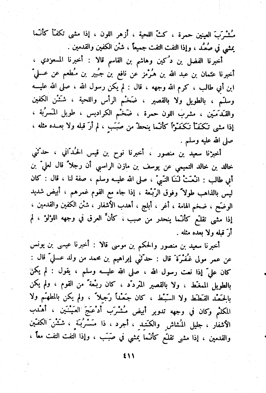 أَخْبَرَنَا سَعِيدُ بْنُ مَنْصُورٍ، وَالْحَكَمُ بْنُ مُوسَى قَالَا: أَخْبَرَنَا عِيسَى بْنُ يُونُسَ، عَنْ عُمَرَ، مَوْلَى غُفْرَةَ قَالَ: حَدَّثَنِي إِبْرَاهِيمُ بْنُ مُحَمَّدٍ مِنْ وَلَدِ عَلِيٍّ قَالَ: كَانَ عَلِيُّ إِذَا نَعَتَ رَسُولَ اللَّهِ صلّى الله عليه وسلم يَقُولُ: §لَمْ يَكُنْ بِالطَّوِيلِ الْمُمَغِّطِ وَلَا بِالْقَصِيرِ الْمُتَرَدِّدِ كَانَ رَبْعَةً مِنَ الْقَوْمِ وَلَمْ يَكُنْ بِالْجَعْدِ الْقَطَطِ وَلَا السَّبْطِ كَانَ جَعْدًا رَجِلًا وَلَمْ يَكُنْ بِالْمُطَهَّمِ وَلَا الْمُكَلْثَمُ وَكَانَ فِي وَجْهِهِ تَدْوِيرٌ أَبْيَضُ مُشْرَبٌ أَدْعَجَ الْعَيْنَيْنِ أَهْدَبَ الْأَشْفَارِ جَلِيلَ الْمُشَاشِ وَالْكَتِدِ أَجْرَدَ ذَا مَسْرُبَةٍ شَثْنَ الْكَفَّيْنِ وَالْقَدَمَيْنِ إِذَا مَشَى تَقَلَّعَ كَأَنَّمَا يَمْشِي فِي صَبَبٍ وَإِذَا الْتَفَتَ الْتَفَتَ مَعًا -[412]-، بَيْنَ كَتِفَيْهِ خَاتَمُ النُّبُوَّةِ وَهُوَ خَاتَمُ النَّبِيِّينَ أَجْوَدَ النَّاسِ كَفًّا وَأَجْرَأَ النَّاسِ صَدْرًا وَأَصْدَقَ النَّاسِ لَهْجَةً وَأَوْفَى النَّاسِ بِذِمَّةٍ وَأَلْيَنَهُمْ عَرِيكَةً وَأَكْرَمَهُمْ عِشْرَةً مَنْ رَآهُ بَدِيهَةً هَابَهُ وَمَنْ خَالَطَهُ مَعْرِفَةً أَحَبَّهُ يَقُولُ نَاعِتُهُ: لَمْ أَرَ قَبْلَهُ وَلَا بَعْدَهُ مِثْلَهُ صلّى الله عليه وسلم
