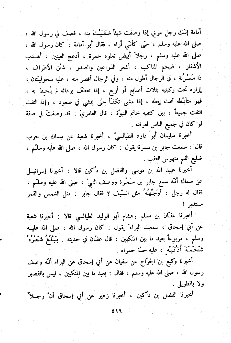 أَخْبَرَنَا سُلَيْمَانُ أَبُو دَاوُدَ الطَّيَالِسِيُّ، أَخْبَرَنَا شُعْبَةُ، عَنْ سِمَاكِ بْنِ حَرْبٍ قَالَ: سَمِعْتُ جَابِرَ بْنَ سَمُرَةَ يَقُولُ: كَانَ رَسُولُ اللَّهِ صلّى الله عليه وسلم §ضَلِيعَ الْفَمِ مَنْهُوسَ الْعَقِبِ