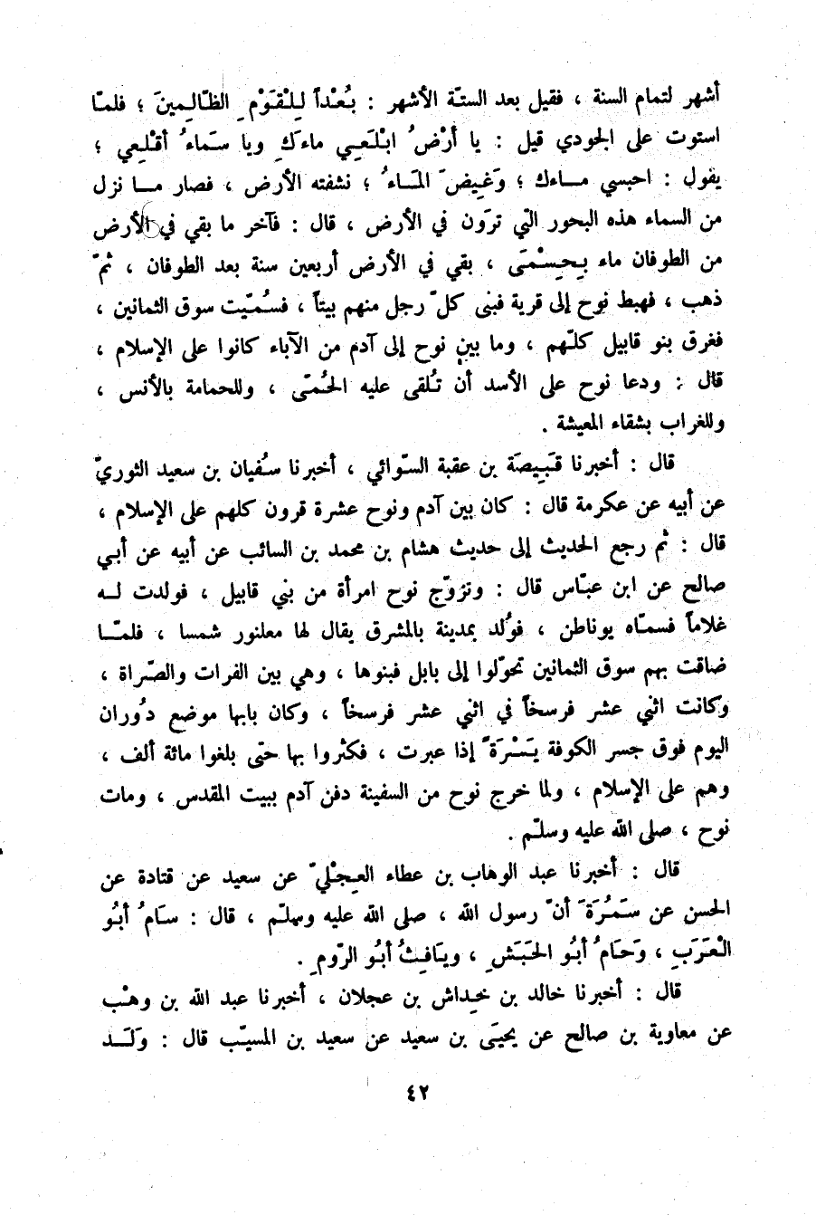 قَالَ: أَخْبَرَنَا قَبِيصَةُ بْنُ عُقْبَةَ السُّوَائِيُّ، أَخْبَرَنَا سُفْيَانُ بْنُ سَعِيدٍ الثَّوْرِيُّ، عَنْ أَبِيهِ، عَنْ عِكْرِمَةَ قَالَ: كَانَ §بَيْنَ آدَمَ وَنُوحٍ عَشَرَةُ قُرُونٍ كُلُّهُمْ عَلَى الْإِسْلَامِ قَالَ: ثُمَّ رَجَعَ الْحَدِيثُ إِلَى حَدِيثِ هِشَامِ بْنِ مُحَمَّدِ بْنِ السَّائِبِ عَنْ أَبِيهِ عَنْ أَبِي صَالِحٍ عَنِ ابْنِ عَبَّاسٍ قَالَ: وَتَزَوَّجَ نُوحٌ امْرَأَةً مِنْ بَنِي قَابِيلَ فَوَلَدَتْ لَهُ غُلَامًا فَسَمَّاهُ يُونَاطِنَ فَوُلِدَ بِمَدِينَةٍ بِالْمَشْرِقِ يُقَالُ لَهَا: معلنور شَمْسًا فَلَمَّا ضَاقَتْ بِهِمْ سُوقُ الثَّمَانِينَ تَحَوَّلُوا إِلَى بَابِلَ فَبَنَوْهَا وَهِيَ بَيْنَ الْفُرَاتِ وَالصُّرَاةِ، وَكَانَتِ اثْنَيْ عَشَرَ فَرْسَخًا فِي اثْنَيْ عَشَرَ فَرْسَخًا وَكَانَ بَابُهَا مَوْضِعَ دُورَانَ الْيَوْمَ فَوْقَ جِسْرِ الْكُوفَةِ يَسْرَةً، إِذَا عَبَرْتَ فَكَثُرُوا بِهَا حَتَّى بَلَغُوا مِائَةَ أَلْفٍ وَهُمْ عَلَى الْإِسْلَامِ، وَلَمَّا خَرَجَ نُوحٌ مِنَ السَّفِينَةِ دَفَنَ آدَمَ بِبَيْتِ الْمَقْدِسِ وَمَاتَ نُوحٌ صلّى الله عليه وسلم