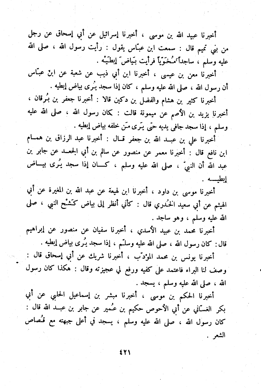 أَخْبَرَنَا يُونُسُ بْنُ مُحَمَّدٍ الْمُؤَدِّبُ، أَخْبَرَنَا شَرِيكٌ، عَنْ أَبِي إِسْحَاقَ قَالَ: وَصَفَ لَنَا الْبَرَاءَ §فَاعْتَمَدَ عَلَى كَفَّيْهِ وَرَفَعَ لِي عَجِيزَتَهُ وَقَالَ: هَكَذَا كَانَ رَسُولُ اللَّهِ صلّى الله عليه وسلم يَسْجُدُ
