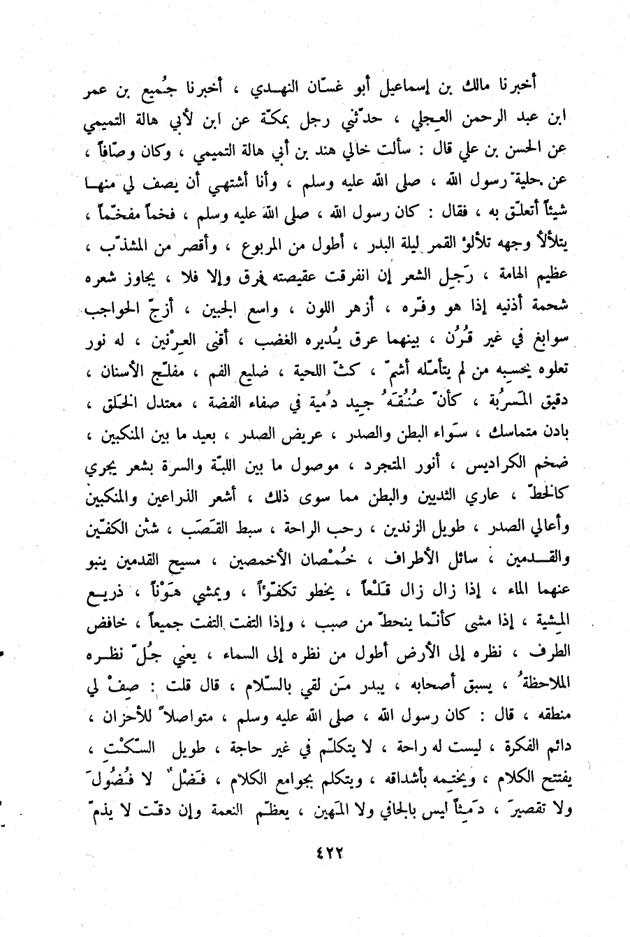 أَخْبَرَنَا مَالِكُ بْنُ إِسْمَاعِيلَ أَبُو غَسَّانَ النَّهْدِيُّ، أَخْبَرَنَا جَمِيعُ بْنُ عُمَرَ بْنِ عَبْدِ الرَّحْمَنِ الْعِجْلِيُّ، حَدَّثَنِي رَجُلٌ، بِمَكَّةَ عَنِ ابْنٍ لِأَبِي هَالَةَ التَّمِيمِيِّ عَنِ الْحَسَنِ بْنِ عَلِيٍّ قَالَ: سَأَلْتُ خَالِي هِنْدَ بْنَ أَبِي هَالَةَ التَّمِيمِيَّ وَكَانَ وَصَّافًا عَنْ حِلْيَةِ، رَسُولِ اللَّهِ صلّى الله عليه وسلم وَأَنَا أَشْتَهِي أَنْ يَصِفَ لِي مِنْهَا شَيْئًا أَتَعَلَّقُ بِهِ فَقَالَ: كَانَ رَسُولُ اللَّهِ صلّى الله عليه وسلم §فَخْمًا مُفَخَّمًا يَتَلَأْلَأُ وَجْهُهُ تَلَأْلُؤَ الْقَمَرِ لَيْلَةَ الْبَدْرِ أَطْوَلَ مِنَ الْمَرْبُوعِ وَأَقْصَرَ مِنَ الْمُشَذَّبِ عَظِيمَ الْهَامَةِ رَجِلَ الشَّعْرِ إِنِ انْفَرَقَتْ عَقِيصَتُهُ فُرِّقَ وَإِلَّا فَلَا، يُجَاوِزُ شَعْرُهُ شَحْمَةَ أُذُنَيْهِ إِذَا هُوَ وَفَّرَهُ أَزْهَرَ اللَّوْنِ وَاسِعَ الْجَبِينِ أَزَجَّ الْحَوَاجِبِ سَوَابِغَ فِي غَيْرِ قُرُنٍ، بَيْنَهُمَا عِرْقٌ يُدِيرُهُ الْغَضَبُ أَقْنَى الْعِرْنَيْنِ لَهُ نُورٌ تَعْلُوهُ يَحْسِبُهُ مَنْ لَمْ يَتَأَمَّلْهُ أَشُمَّ كَثَّ اللِّحْيَةِ ضَلِيعَ الْفَمِ مُفْلَجَ الْأَسْنَانِ دَقِيقَ الْمَسْرُبَةِ كَأَنَّ عُنُقَهُ جِيدُ دُمْيَةٍ فِي صَفَاءِ الْفِضَّةِ مُعْتَدِلَ الْخَلْقِ بَادِنًا مُتَمَاسِكًا سَوَاءَ الْبَطْنِ وَالصَّدْرِ عَرِيضَ الصَّدْرِ بَعِيدَ مَا بَيْنَ الْمَنْكِبَيْنِ ضَخْمَ الْكَرَادِيسِ أَنْوَرَ الْمُتَجَرِّدِ مَوْصُولَ مَا بَيْنَ اللَّبَّةِ وَالسُّرَّةِ بِشَعْرٍ يَجْرِي كَالْخَطِّ عَارِي الثَّدْيَيْنِ وَالْبَطْنِ مِمَّا سِوَى ذَلِكَ أَشْعَرَ الذِّرَاعَيْنِ وَالْمَنْكِبَيْنِ وَأَعَالِي الصَّدْرِ طَوِيلَ الزَّنْدَيْنِ رَحْبَ الرَّاحَةِ سَبْطَ الْقَصَبِ شَثْنَ الْكَفَّيْنِ وَالْقَدَمَيْنِ سَائِلَ الْأَطْرَافِ خُمْصَانَ الْأَخْمَصَيْنِ مَسِيحَ الْقَدَمَيْنِ يَنْبُو عَنْهُمَا الْمَاءُ إِذَا زَالَ زَالَ قَلْعًا يَخْطُو تَكَفُّؤًا وَيَمْشِي هَوْنًا ذَرِيعَ الْمِشْيَةِ إِذَا مَشَى كَأَنَّمَا يَنْحَطُّ مِنْ صَبَبٍ وَإِذَا أَلْتَفَتَ الْتَفَتَ جَمِيعًا خَافِضَ الطَّرْفِ نَظَرُهُ إِلَى الْأَرْضِ أَطْوَلُ مِنْ نَظَرِهِ إِلَى السَّمَاءِ يَعْنِي جُلَّ نَظَرِهِ الْمُلَاحَظَةُ يَسْبِقُ أَصْحَابَهُ يَبْدُرُ مَنْ لَقِيَ بِالسَّلَامِ قَالَ: قُلْتُ صِفْ لِي مَنْطِقَهُ قَالَ: كَانَ رَسُولُ اللَّهِ صلّى الله عليه وسلم مُتَواصِلًا لِلْأَحْزَانِ دَائِمَ الْفِكْرَةِ لَيْسَتْ لَهُ رَاحَةٌ لَا يَتَكَلَّمُ فِي غَيْرِ حَاجَةٍ طَوِيلَ السَّكْتِ يَفْتَتِحُ الْكَلَامَ وَيَخْتِمُهُ بِأَشْدَاقِهِ وَيَتَكَلَّمُ بِجَوَامِعِ الْكَلَامِ، فَضْلٌ لَا فُضُولَ وَلَا تَقْصِيرَ دَمِثًا لَيْسَ بِالْجَافِي وَلَا الْمَهِينِ يُعَظِّمُ النِّعْمَةَ وَإِنْ دَقَّتْ لَا يَذِمُّ -[423]- مِنْهَا شَيْئًا لَا يَذِمُّ ذَوَاقًا وَلَا يَمْدَحُهُ لَا تُغْضِبُهُ الدُّنْيَا وَمَا كَانَ لَهَا فَإِذَا تُعُوطِيَ الْحَقَّ لَمْ يَعْرِفْهُ أَحَدٌ وَلَمْ يَقُمْ لِغَضَبِهِ شَيْءٌ حَتَّى يَنْتَصِرَ لَهُ لَا يَغْضَبُ لِنَفْسِهِ وَلَا يَنْتَصِرُ لَهَا إِذَا أَشَارَ أَشَارَ بِكَفِّهِ كُلَّهَا وَإِذَا تَعَجَّبَ قَلَّبَهَا وَإِذَا تَحَدَّثَ اتَّصَلَ بِهَا يَضْرِبُ بِرَاحَتِهِ الْيُمْنَى بَاطِنَ إِبْهَامِهِ الْيُسْرَى وَإِذَا غَضِبَ أَعْرَضَ وَأَشَاحَ وَإِذَا فَرِحَ غَضَّ طَرْفَهُ، جُلُّ ضَحِكُهُ التَّبَسُّمُ وَيَفْتِرُّ عَنْ مِثْلِ حُبِّ الْغَمَامِ قَالَ: فَكَتَمْتُهَا الْحُسَيْنَ بْنَ عَلِيٍّ زَمَانًا ثُمَّ حَدَّثْتُهُ فَوَجَدْتُهُ قَدْ سَبَقَنِي إِلَيْهِ فَسَأَلَهُ عَمَّا سَأَلْتُهُ عَنْهُ وَوَجَدْتُهُ قَدْ سَأَلَ أَبَاهُ عَنْ مُدْخَلِهِ وَمَجْل